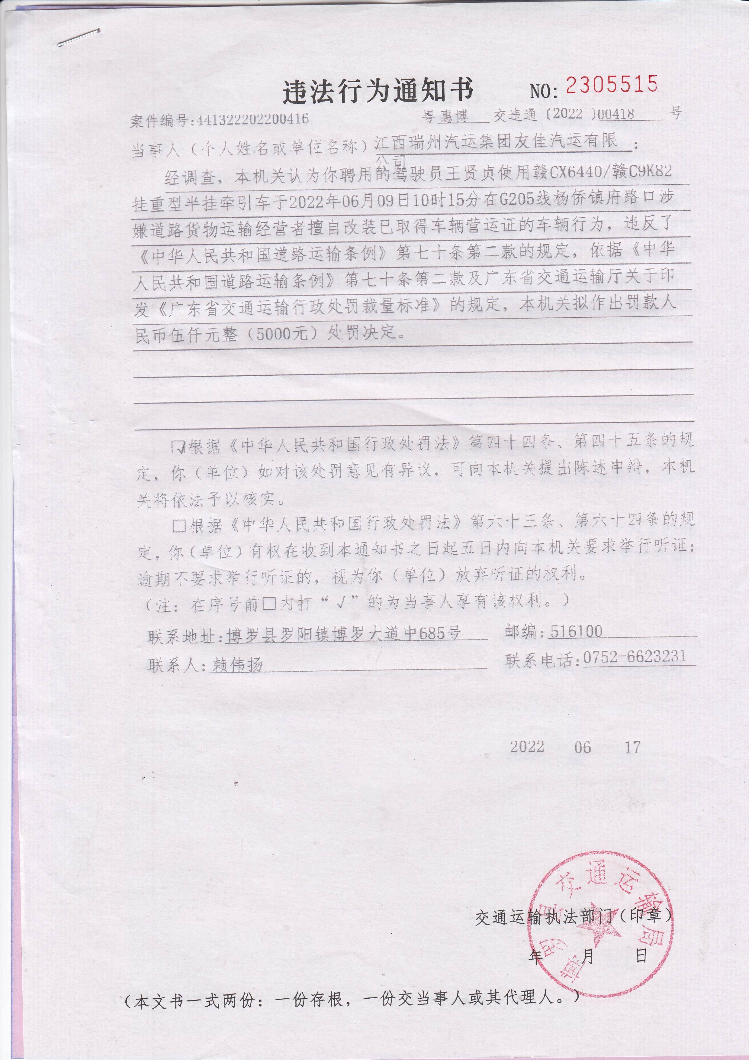經(jīng)本機(jī)關(guān)依法查明,認(rèn)為你公司聘用的駕駛員王賢貞使用贛CX6440/贛C9K82掛重型半掛牽引車于2022年06月09日10時(shí)15分在G205線楊僑鎮(zhèn)政府路口涉嫌道路貨物運(yùn)輸經(jīng)營(yíng)者擅自改裝已取得車輛營(yíng)運(yùn)證的車輛行為,違反了《中華人民共和國(guó)道路運(yùn)輸條例》第七十條第二款的規(guī)定,依據(jù)《中華人民共和國(guó)道路運(yùn)輸條例》第七十條第二款及廣東省交通運(yùn)輸廳關(guān)于印發(fā)《廣東省交通運(yùn)輸行政處罰裁量標(biāo)準(zhǔn)》的規(guī)定,本機(jī)關(guān)擬作出罰款人民幣伍仟元整(5000元)處罰決定。因其他法定方式無(wú)法送達(dá),現(xiàn)依法向你單位公告送達(dá)《違法行為通知書》(惠博交字【2022】00418號(hào)),自公告之日起30日內(nèi)來(lái)我局(博羅縣羅陽(yáng)街道辦事處博羅大道中685號(hào))簽收,逾期視為送達(dá)。