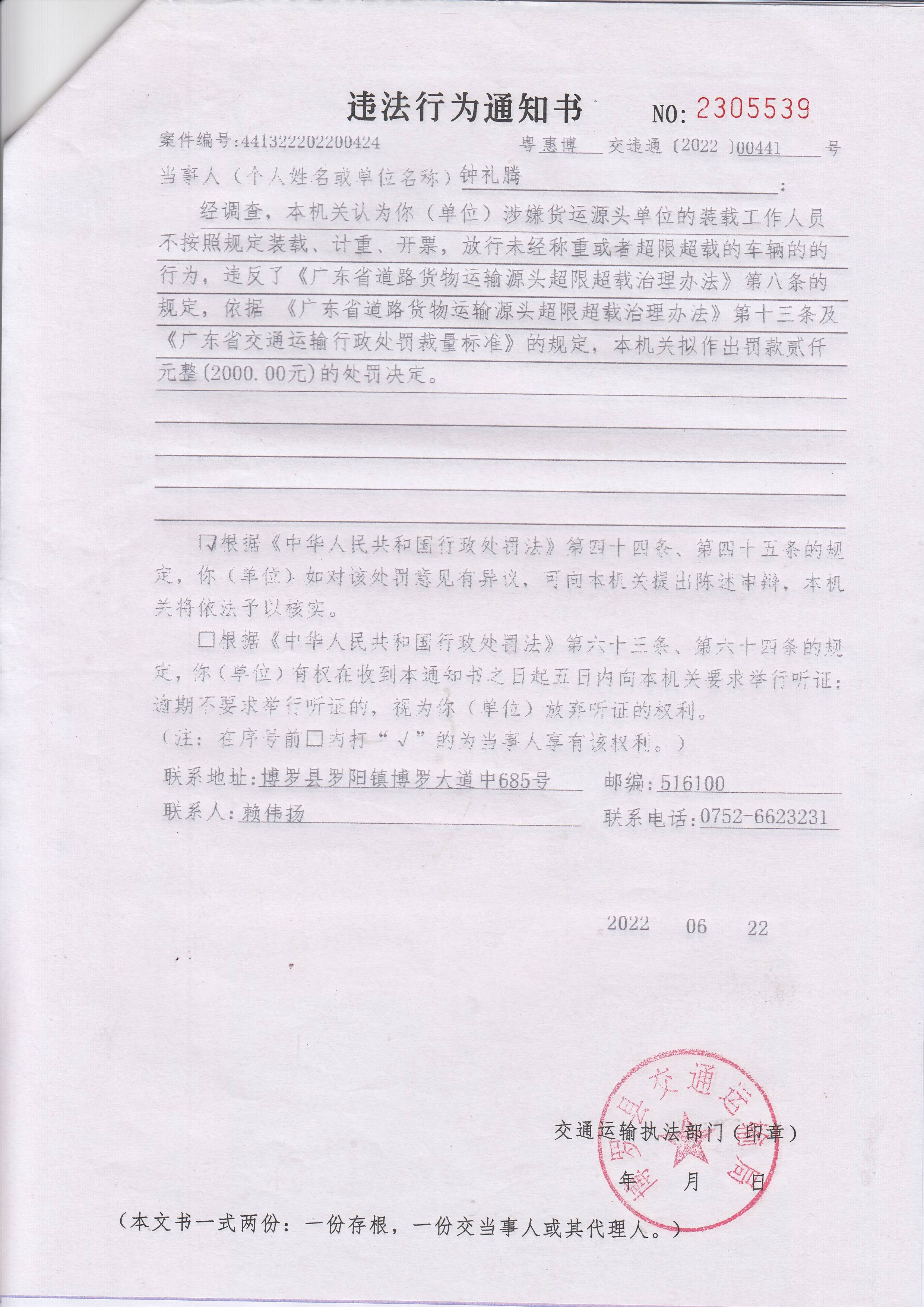 經本機關依法查明,認為你涉嫌貨運源頭單位的裝載工作人員不按照規定裝載、計重、開票,放行未經稱重或者超限超載的車輛的行為,違反了《廣東省道路貨物運輸源頭超限超載治理辦法》第八條的規定,依據 《廣東省道路貨物運輸源頭超限超載治理辦法》第十三條及《廣東省交通運輸行政處罰裁量標準》的規定,本機關擬作出罰款貳仟元整(2000.00元)的處罰決定。因其他法定方式無法送達,現依法向你單位公告送達《違法行為通知書》(惠博交字【2022】00441號),自公告之日起30日內來我局(博羅縣羅陽街道辦事處博羅大道中685號)簽收,逾期視為送達。