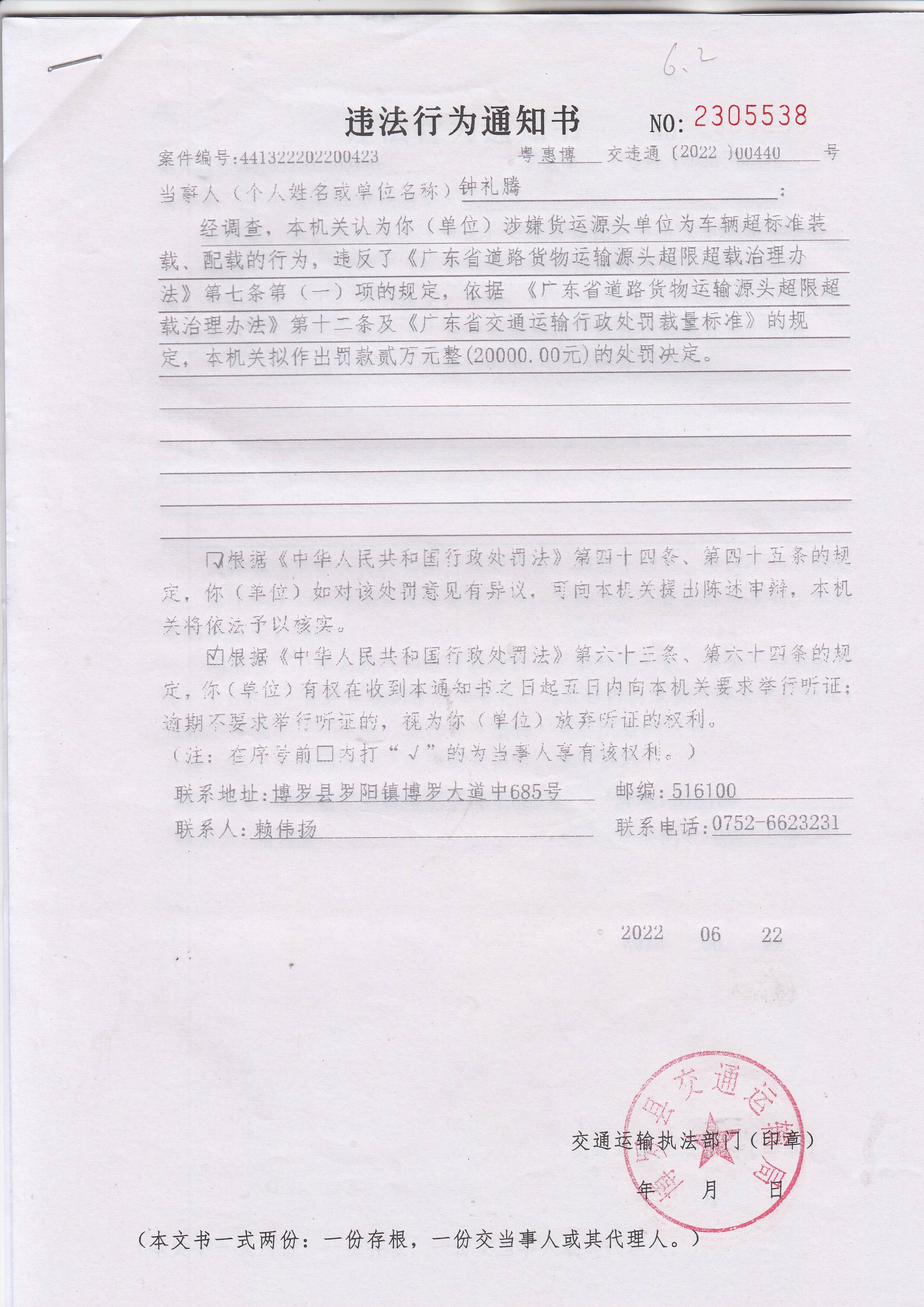 經本機關依法查明,認為你涉嫌貨運源頭單位為車輛超標準裝載、配載的行為,違反了《廣東省道路貨物運輸源頭超限超載治理辦法》第七條第(一)項的規定,依據 《廣東省道路貨物運輸源頭超限超載治理辦法》第十二條及《廣東省交通運輸行政處罰裁量標準》的規定,本機關擬作出罰款貳萬元整(20000.00元)的處罰決定。因其他法定方式無法送達,現依法向你單位公告送達《違法行為通知書》(惠博交字【2022】00440號),自公告之日起30日內來我局(博羅縣羅陽街道辦事處博羅大道中685號)簽收,逾期視為送達。