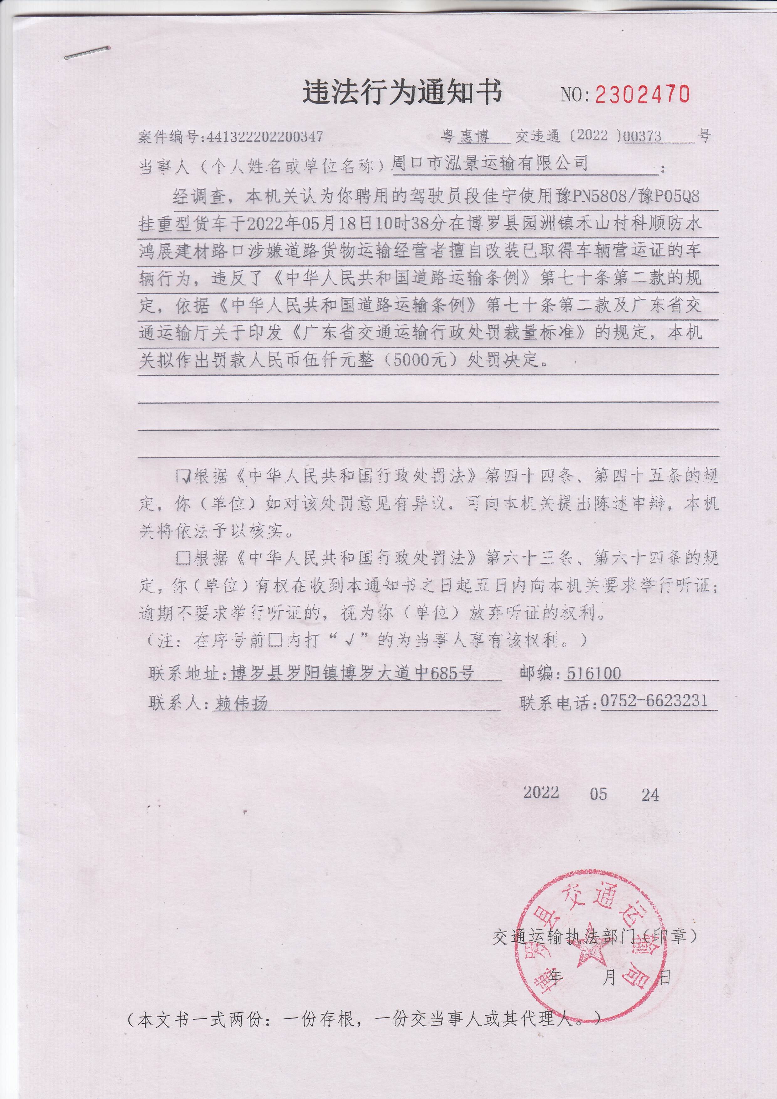經本機關依法查明,認為你公司聘用的駕駛員段佳寧使用豫PN5808/豫P05Q8掛重型貨車于2022年05月18日10時38分在博羅縣園洲鎮禾山村科順防水鴻展建材路口涉嫌道路貨物運輸經營者擅自改裝已取得車輛營運證的車輛行為,違反了《中華人民共和國道路運輸條例》第七十條第二款的規定,依據《中華人民共和國道路運輸條例》第七十條第二款及廣東省交通運輸廳關于印發《廣東省交通運輸行政處罰裁量標準》的規定,本機關擬作出罰款人民幣伍仟元整(5000元)處罰決定。因其他法定方式無法送達,現依法向你單位公告送達《違法行為通知書》(惠博交字【2022】00373號),自公告之日起30日內來我局(博羅縣羅陽街道辦事處博羅大道中685號)簽收,逾期視為送達。