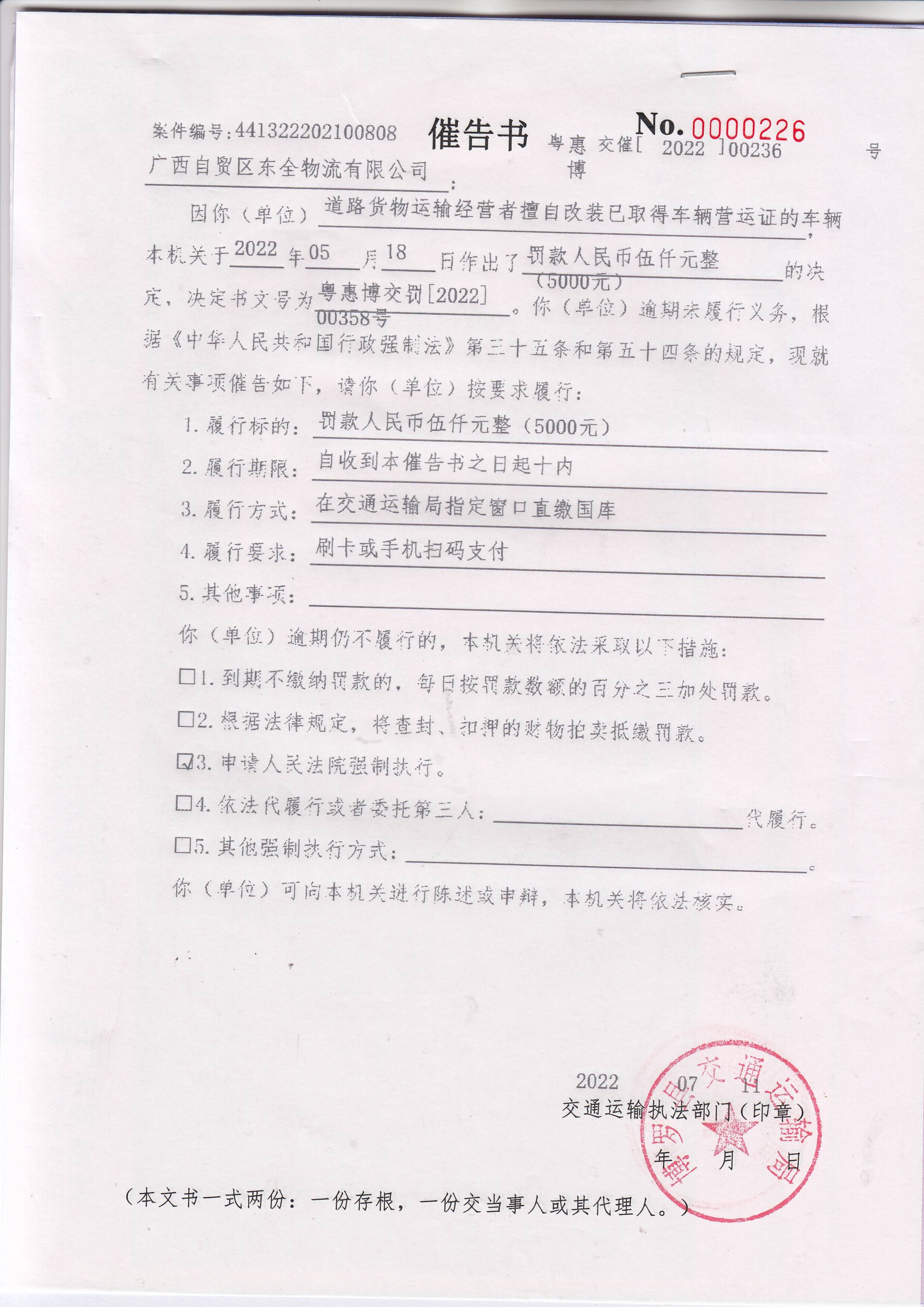 二、根據(jù)《中華人民共和國行政強制法》第三十五條和第五十四的規(guī)定,現(xiàn)催告你公司,自收到本催告書之日起10日內(nèi),到博羅縣交通運輸局違章處理窗口(博羅縣羅陽街道辦事處博羅大道中685號)將罰款5000元繳至指定銀行。