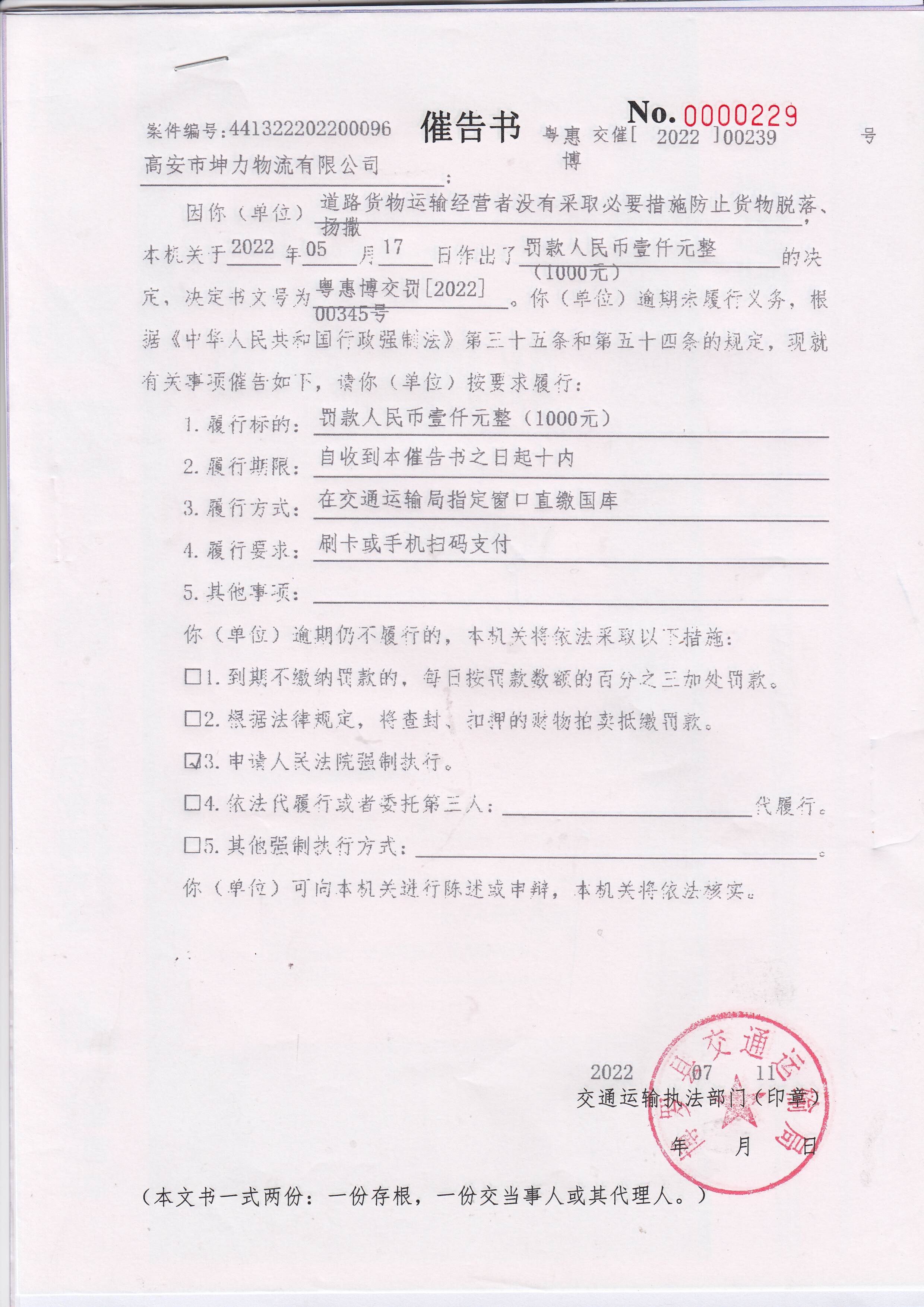一、你公司使用贛CAE682重型自卸貨車沒有采取必要措施防止貨物脫落、揚撒一案,本機關于2022年05月17日作出了罰款人民幣壹仟元整(1000元)的決定,決定書文號為:惠博交罰[2022]00345號),但你公司在本機關決定的期限內不履行義務。