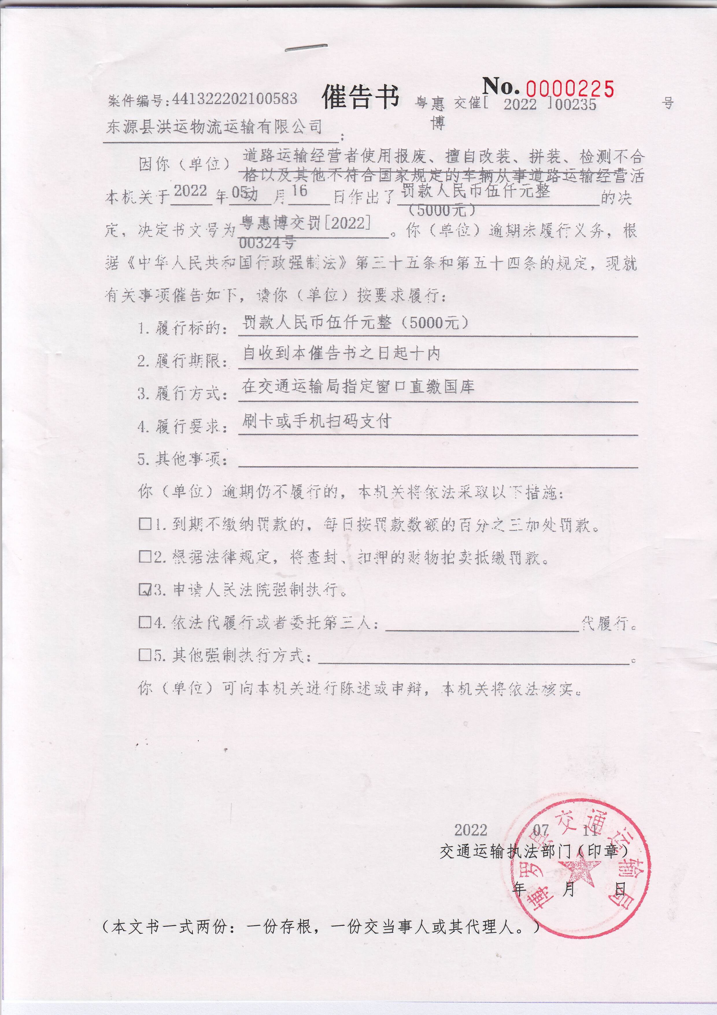 一、你公司使用粵RF155掛重型平板自卸半掛車擅自改裝的車輛從事道路運輸經營活動案,本機關于2022年05月16日作出了罰款人民幣伍仟元整(5000元)的決定,決定書文號為:惠博交罰[2022]00324號),但你公司在本機關決定的期限內不履行義務。