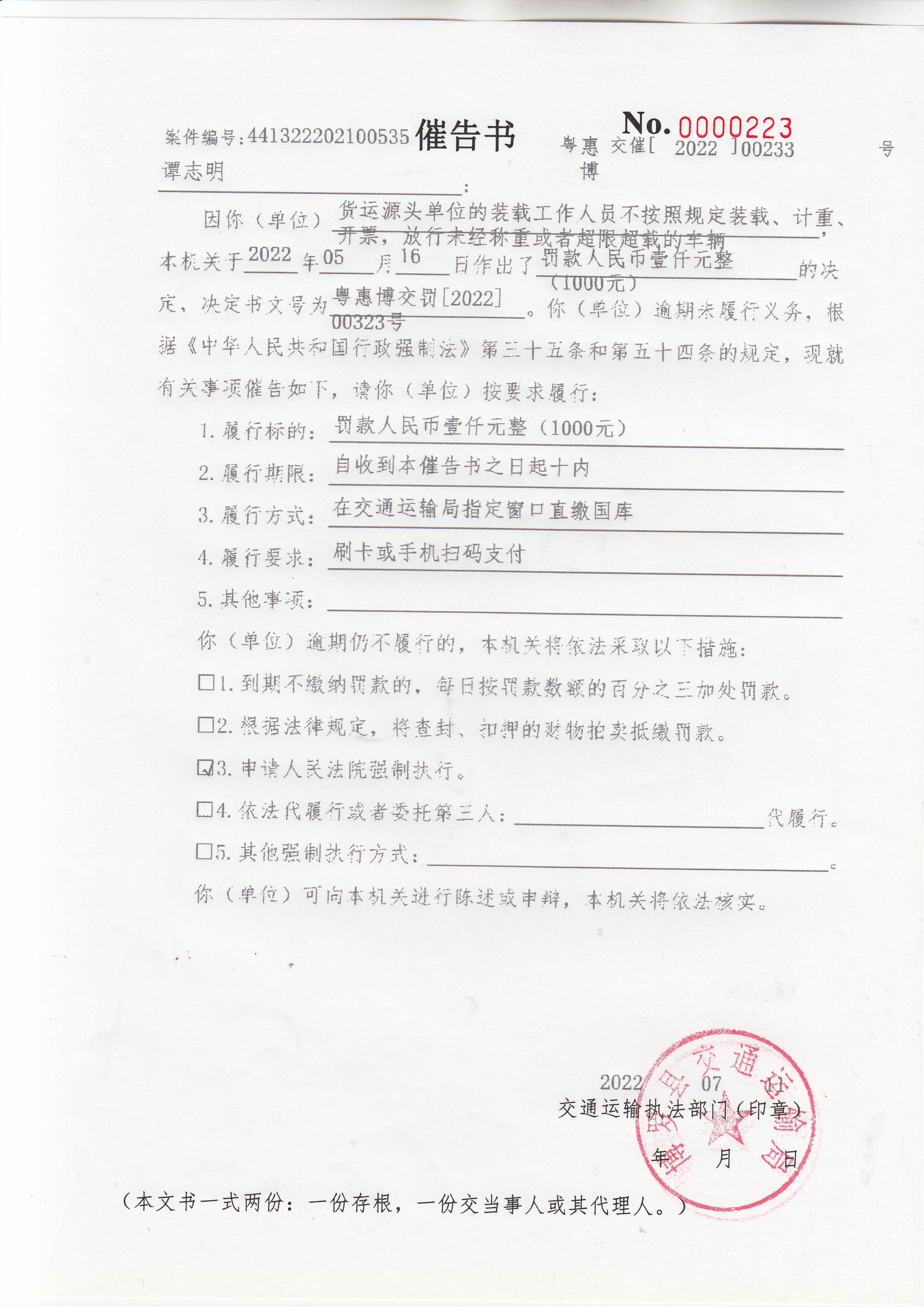 一、廣東新峰藥業(yè)股份有限公司的裝載工作人員譚志明放行超限超載的車輛案,本機(jī)關(guān)于2022年05月16日作出了罰款人民幣壹仟元整(1000元)的決定,決定書文號為:惠博交罰[2022]00323號),但你在本機(jī)關(guān)決定的期限內(nèi)不履行義務(wù)。