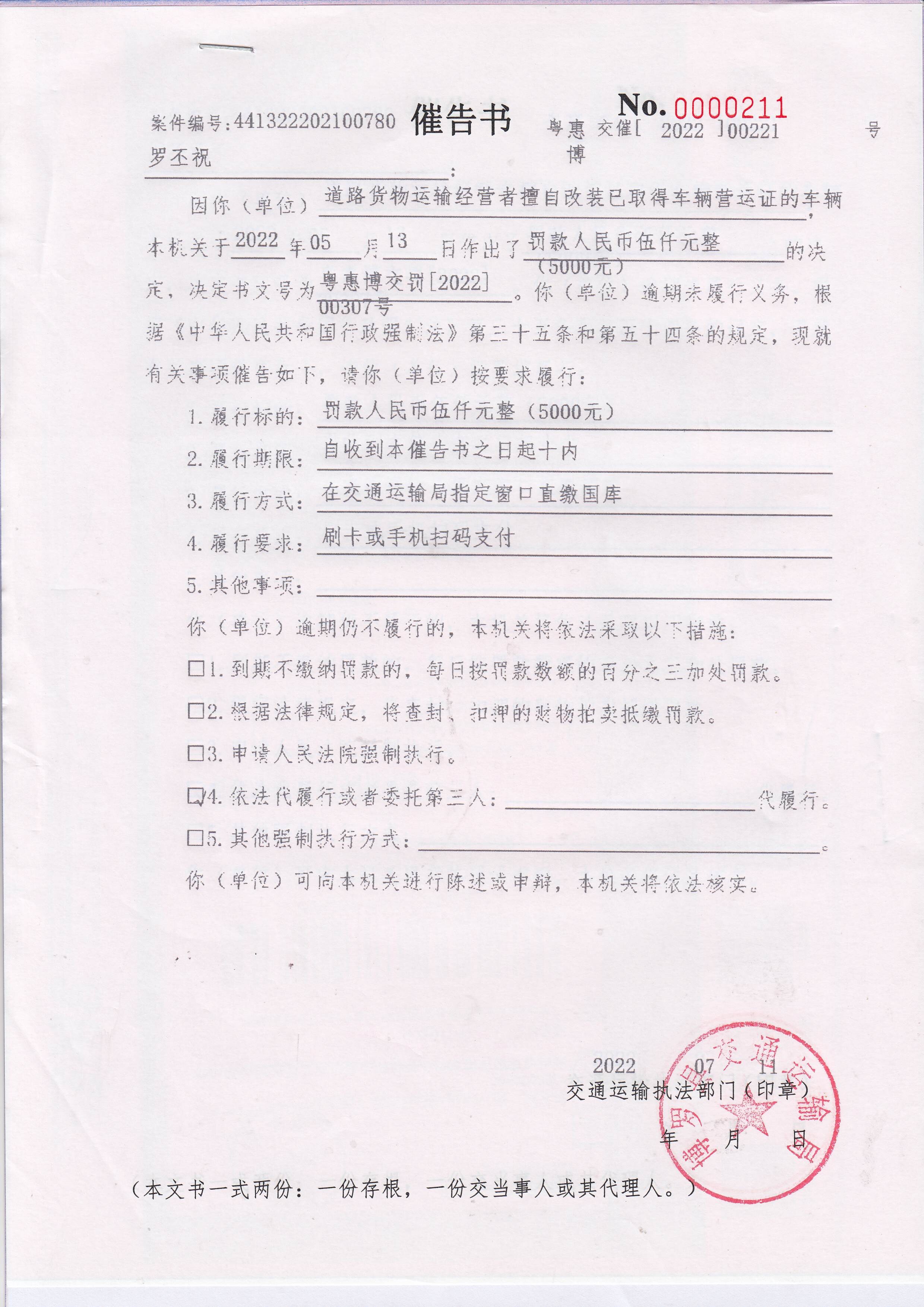 二、根據《中華人民共和國行政強制法》第三十五條和第五十四的規定,現催告你,自收到本催告書之日起10日內,到博羅縣交通運輸局違章處理窗口(博羅縣羅陽街道辦事處博羅大道中685號)將罰款5000元繳至指定銀行。