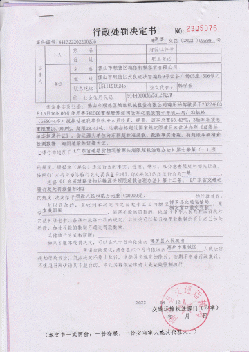 你公司聘用的駕駛員于2022年03月15日10時(shí)00分使用粵G41566重型特殊結(jié)構(gòu)貨車運(yùn)載貨物于中鐵二局廣汕鐵路(GSSG-4標(biāo))攪拌站被我單位執(zhí)法人員檢查,經(jīng)查,該車總重53.43噸,3軸車車貨總重限重25.000噸,超限28.43噸,運(yùn)載指標(biāo)超過國家規(guī)定限值且未依法辦理《超限運(yùn)輸車輛通行證》。貨運(yùn)源頭單位為車輛超標(biāo)準(zhǔn)裝載、配載事實(shí)清楚,有超限車輛稽查檢測數(shù)據(jù),詢問筆錄等證據(jù)為證。違反了《廣東省道路貨物運(yùn)輸源頭超限超載治理辦法》第七條第(一)項(xiàng)的規(guī)定,依據(jù)《廣東省道路貨物運(yùn)輸源頭超限超載治理辦法》第十二條、《廣東省交通運(yùn)輸行政處罰裁量標(biāo)準(zhǔn)》的規(guī)定。決定給予罰款人民幣貳萬元整(20000)的行政處罰。我局通過直接送達(dá)、郵寄送達(dá)等方式無法送達(dá)《行政處罰決定書》,現(xiàn)依法向你公告送達(dá)《行政處罰決定書》【編號(hào):惠博交罰〔2022〕00599號(hào)】,限你自公告之日起30日內(nèi)到我局領(lǐng)取《行政處罰決定書》(博羅縣羅陽街道博羅大道中685號(hào)),逾期則視為送達(dá)。