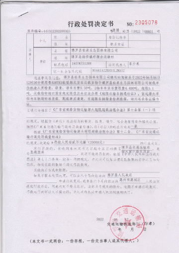 你公司聘用的駕駛員于2022年04月06日12時50分使用粵A50TR3輕型廂式貨車運載貨物于博羅縣松泉生態園林有限公司被我單位執法人員檢查,經查,該車總重9.59噸,2軸車車貨總重限重4.490噸,超限5.1噸,運載指標超過國家規定限值且未依法辦理《超限運輸車輛通行證》。貨運源頭單位為車輛超標準裝載、配載事實清楚,有超限車輛稽查檢測數據,詢問筆錄等證據為證。違反了《廣東省道路貨物運輸源頭超限超載治理辦法》第七條第(一)項的規定,依據《廣東省道路貨物運輸源頭超限超載治理辦法》第十二條、《廣東省交通運輸行政處罰裁量標準》的規定。本機關決定給予罰款貳萬元整(20000.00元)的行政處罰。我局通過直接送達、郵寄送達等方式無法送達《行政處罰決定書》,現依法向你公告送達《行政處罰決定書》【編號:惠博交罰〔2022〕00601號】,限你自公告之日起30日內到我局領取《行政處罰決定書》(博羅縣羅陽街道博羅大道中685號),逾期則視為送達。