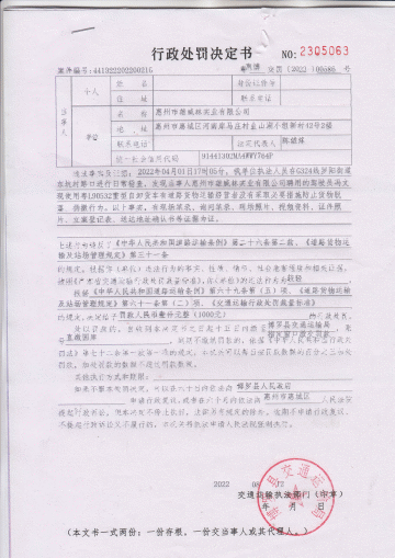 2022年04月01日17時05分,我單位執法人員在G324線羅陽街道東坑村路口進行日常稽查,發現當事人惠州市雄威林實業有限公司聘用的駕駛員馮文現使用粵L90532重型自卸貨車有道路貨物運輸經營者沒有采取必要措施防止貨物脫落、揚撒行為。以上事實,有現場筆錄、詢問筆錄、現場照片、視頻資料、證件照片、立案登記表、送達地址確認書等證據為證。違反了《中華人民共和國道路運輸條例》第二十六條第二款、《道路貨物運輸及站場管理規定》第三十一條的規定,依據《中華人民共和國道路運輸條例》第六十九條第(五)項、《道路貨物運輸及站場管理規定》第六十一條第(二)項、《交通運輸行政處罰裁量標準》的規定。決定給予罰款人民幣壹仟元整(1000.00元)的行政處罰。我局通過直接送達、郵寄送達等方式無法送達《行政處罰決定書》,現依法向你公告送達《行政處罰決定書》【編號:惠博交罰〔2022〕00586號】,限你自公告之日起30日內到我局領取《行政處罰決定書》(博羅縣羅陽街道博羅大道中685號),逾期則視為送達。