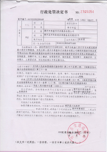 2022年06月22日16時10分,我單位執法人員在雙龍大道北堤村路口進行日常稽查,發現當事人惠州市粵富華汽車服務有限公司聘用的駕駛員陳勁使用粵L63549/粵LM679掛重型半掛牽引車有道路貨物運輸經營者沒有采取必要措施防止貨物脫落、揚撒行為。以上事實,有現場筆錄、詢問筆錄、現場照片、視頻資料、證件照片、立案登記表、送達地址確認書等證據為證。違反了《中華人民共和國道路運輸條例》第二十六條第二款、《道路貨物運輸及站場管理規定》第三十一條的規定,依據《中華人民共和國道路運輸條例》第六十九條第(五)項、《道路貨物運輸及站場管理規定》第六十一條第(二)項、《交通運輸行政處罰裁量標準》的規定。決定給予罰款人民幣壹仟元整(1000.00元)的行政處罰。我局通過直接送達、郵寄送達等方式無法送達《行政處罰決定書》,現依法向你公告送達《行政處罰決定書》【編號:惠博交罰〔2022〕00577號】,限你自公告之日起30日內到我局領取《行政處罰決定書》(博羅縣羅陽街道博羅大道中685號),逾期則視為送達。
