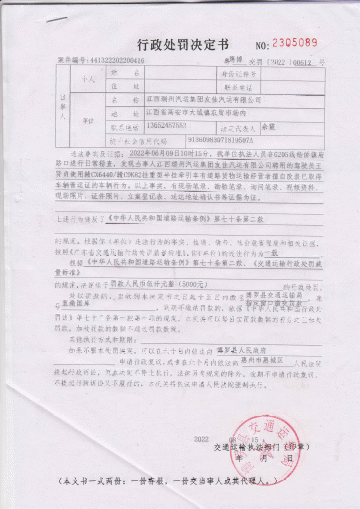 2022年06月09日10時15分,我單位執法人員在G205線楊僑鎮政府路口進行日常稽查,發現當事人江西瑞州汽運集團友佳汽運有限公司聘用的駕駛員王賢貞使用贛CX6440/贛C9K82掛重型半掛牽引車有道路貨物運輸經營者擅自改裝已取得車輛營運證的車輛行為。以上事實,有現場筆錄、勘驗筆錄、詢問筆錄、視頻資料、現場照片、證件照片、立案登記表、送達地址確認書等證據為證。違反了《中華人民共和國道路運輸條例》第七十條第二款的規定,依據《中華人民共和國道路運輸條例》第七十條第二款、《交通運輸行政處罰裁量標準》的規定。決定給予罰款人民幣伍仟元整(5000)的行政處罰。我局通過直接送達、郵寄送達等方式無法送達《行政處罰決定書》,現依法向你公告送達《行政處罰決定書》【編號:惠博交罰〔2022〕00612號】,限你自公告之日起30日內到我局領取《行政處罰決定書》(博羅縣羅陽街道博羅大道中685號),逾期則視為送達。