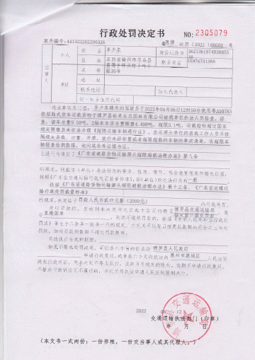 你聘用的駕駛員于2022年04月06日12時50分使用粵A50TR3輕型廂式貨車運載貨物于博羅縣松泉生態園林有限公司被我單位執法人員檢查,經查,該車總重9.59噸,2軸車車貨總重限重4.490噸,超限5.1噸,運載指標超過國家規定限值且未依法辦理《超限運輸車輛通行證》。貨運源頭單位的裝載工作人員不按照規定裝載、計重、開票,放行未經稱重或者超限超載的車輛的事實清楚,有超限車輛稽查檢測數據,詢問筆錄等證據為證。違反了《廣東省道路貨物運輸源頭超限超載治理辦法》第八條的規定,依據《廣東省道路貨物運輸源頭超限超載治理辦法》第十三條、《廣東省交通運輸行政處罰裁量標準》的規定。決定給予罰款人民幣貳仟元整(2000)的行政處罰。我局通過直接送達、郵寄送達等方式無法送達《行政處罰決定書》,現依法向你公告送達《行政處罰決定書》【編號:惠博交罰〔2022〕00602號】,限你自公告之日起30日內到我局領取《行政處罰決定書》(博羅縣羅陽街道博羅大道中685號),逾期則視為送達。