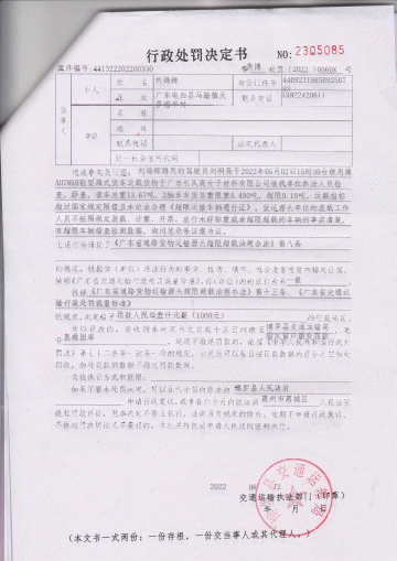 你聘用的駕駛員劉明亮于2022年05月02日15時30分使用贛AH78K0輕型廂式貨車運(yùn)載貨物于廣東長風(fēng)高分子材料有限公司被我單位執(zhí)法人員檢查,經(jīng)查,該車總重13.67噸,2軸車車貨總重限重4.490噸,超限9.18噸,運(yùn)載指標(biāo)超過國家規(guī)定限值且未依法辦理《超限運(yùn)輸車輛通行證》。貨運(yùn)源頭單位的裝載工作人員不按照規(guī)定裝載、計重、開票,放行未經(jīng)稱重或者超限超載的車輛的事實清楚,有超限車輛稽查檢測數(shù)據(jù),詢問筆錄等證據(jù)為證。違反了《廣東省道路貨物運(yùn)輸源頭超限超載治理辦法》第八條的規(guī)定,依據(jù)《廣東省道路貨物運(yùn)輸源頭超限超載治理辦法》第十三條、《廣東省交通運(yùn)輸行政處罰裁量標(biāo)準(zhǔn)》的規(guī)定。決定給予罰款人民幣壹仟元整(1000)的行政處罰。我局通過直接送達(dá)、郵寄送達(dá)等方式無法送達(dá)《行政處罰決定書》,現(xiàn)依法向你公告送達(dá)《行政處罰決定書》【編號:惠博交罰〔2022〕00608號】,限你自公告之日起30日內(nèi)到我局領(lǐng)取《行政處罰決定書》(博羅縣羅陽街道博羅大道中685號),逾期則視為送達(dá)。