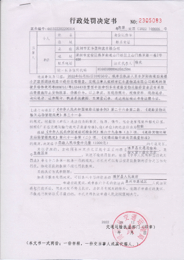 2022年05月05日10時50分,我單位執法人員在羅陽街道四角樓小羅路西湖技校路口進行日常稽查,發現當事人深圳市匯豐盈物流有限公司聘用的駕駛員楊偉使用粵BHM751/粵LLB443掛重型半掛牽引車有道路貨物運輸經營者沒有采取必要措施防止貨物脫落、揚撒行為。以上事實,有現場照片、視頻資料、現場筆錄、詢問筆錄、證件照片、執法系統截圖、立案登記表、送達地址確認書等證據為證。違反了《中華人民共和國道路運輸條例》第二十六條第二款、《道路貨物運輸及站場管理規定》第三十一條的規定,依據《中華人民共和國道路運輸條例》第六十九條第(五)項、《道路貨物運輸及站場管理規定》第六十一條第(二)項、《交通運輸行政處罰裁量標準》的規定。決定給予罰款人民幣壹仟元整(1000)的行政處罰。我局通過直接送達、郵寄送達等方式無法送達《行政處罰決定書》,現依法向你公告送達《行政處罰決定書》【編號:惠博交罰〔2022〕00606號】,限你自公告之日起30日內到我局領取《行政處罰決定書》(博羅縣羅陽街道博羅大道中685號),逾期則視為送達。