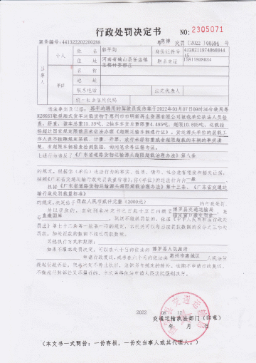 郭平均聘用的駕駛員范傳理于2022年03月07日09時36分使用粵R28K61輕型廂式貨車運載貨物于惠州市市明新再生資源有限公司被我單位執法人員檢查,經查,該車總重15.39噸,2軸車車貨總重限重4.495噸,超限10.895噸,運載指標超過國家規定限值且未依法辦理《超限運輸車輛通行證》。貨運源頭單位的裝載工作人員不按照規定裝載、計重、開票,放行未經稱重或者超限超載的車輛的事實清楚,有超限車輛稽查檢測數據,詢問筆錄等證據為證。違反了《廣東省道路貨物運輸源頭超限超載治理辦法》第七條第(一)項的規定,依據《廣東省道路貨物運輸源頭超限超載治理辦法》第十二條、《廣東省交通運輸行政處罰裁量標準》的規定。決定給予罰款人民幣貳仟元整(2000.00元)的行政處罰。我局通過直接送達、郵寄送達等方式無法送達《行政處罰決定書》,現依法向你公告送達《行政處罰決定書》【編號:惠博交罰〔2022〕00594號】,限你自公告之日起30日內到我局領取《行政處罰決定書》(博羅縣羅陽街道博羅大道中685號),逾期則視為送達。