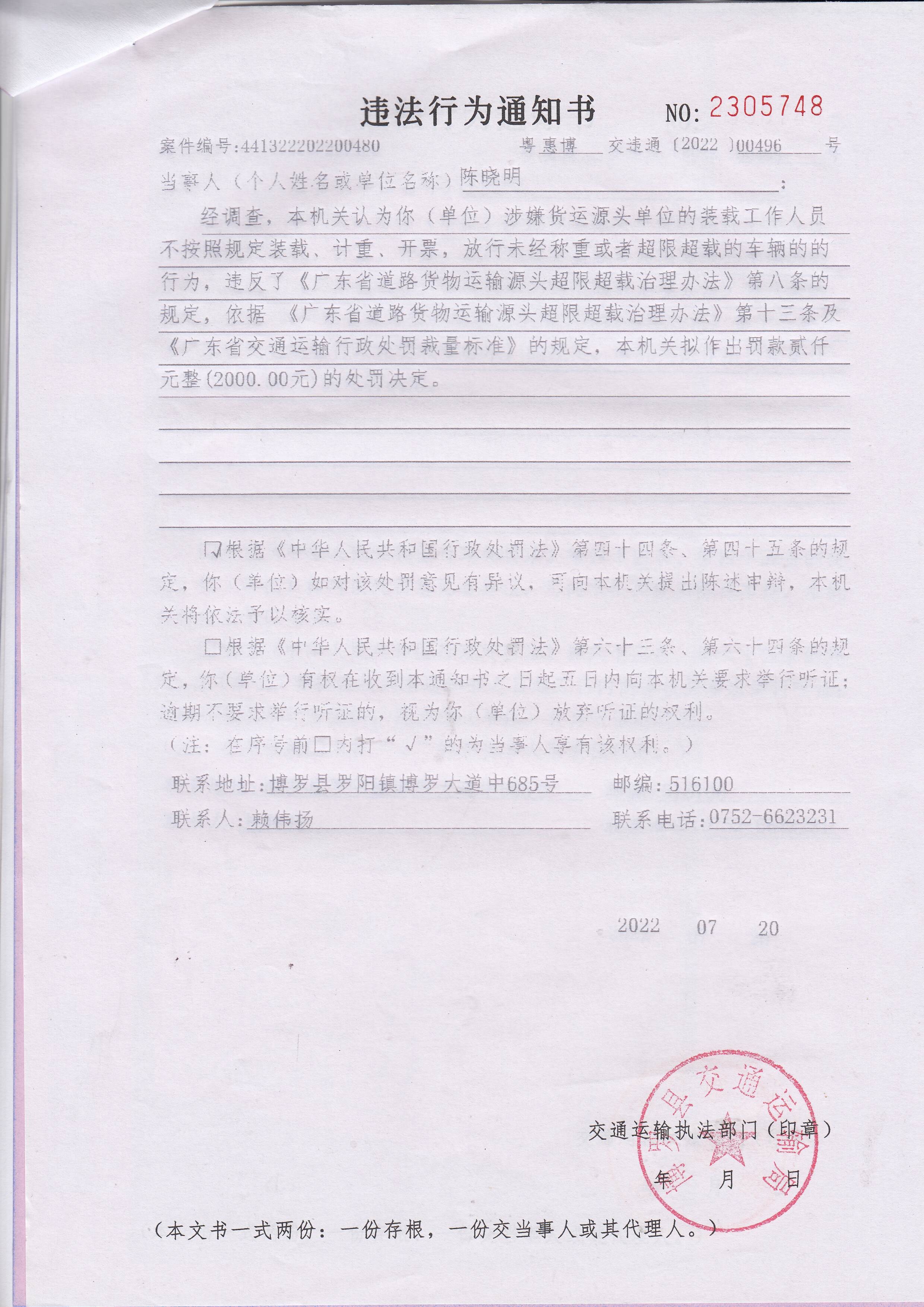 經調查,本機關認為你(單位)涉嫌貨運源頭單位的裝載工作人員不按照規定裝載、計重、開票,放行未經稱重或者超限超載的車輛的行為,違反了《廣東省道路貨物運輸源頭超限超載治理辦法》第八條的規定,依據 《廣東省道路貨物運輸源頭超限超載治理辦法》第十三條及《廣東省交通運輸行政處罰裁量標準》的規定,本機關擬作出罰款貳仟元整(2000.00元)的處罰決定。因其他法定方式無法送達,現依法向你單位公告送達《違法行為通知書》(惠博交字【2022】00496號),自公告之日起30日內來我局(博羅縣羅陽街道辦事處博羅大道中685號)簽收,逾期視為送達。