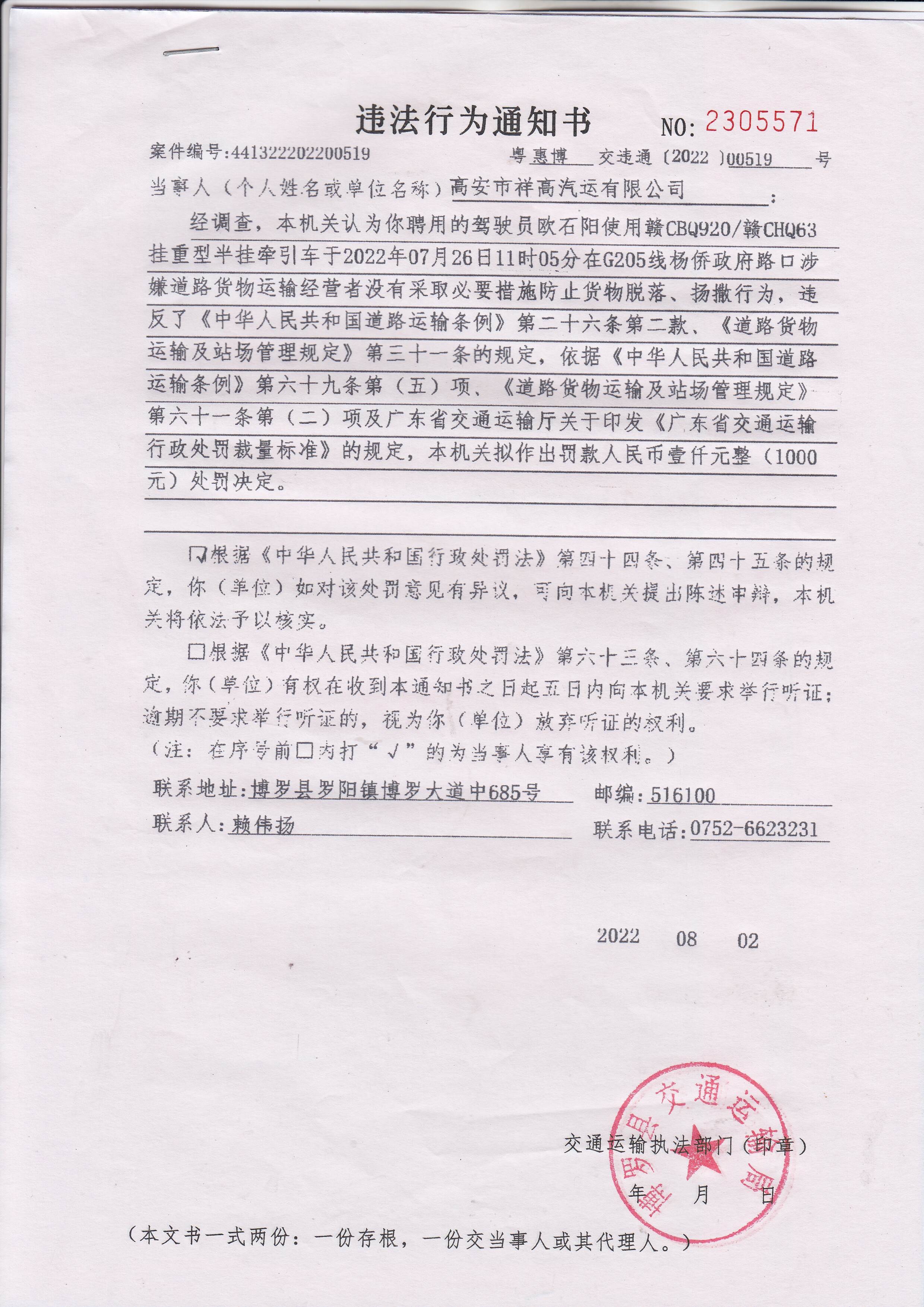 經(jīng)調(diào)查,本機關(guān)認(rèn)為你聘用的駕駛員歐石陽使用贛CBQ920/贛CHQ63掛重型半掛牽引車于2022年07月26日11時05分在G205線楊僑政府路口涉嫌道路貨物運輸經(jīng)營者沒有采取必要措施防止貨物脫落、揚撒行為,違反了《中華人民共和國道路運輸條例》第二十六條第二款、《道路貨物運輸及站場管理規(guī)定》第三十一條的規(guī)定,依據(jù)《中華人民共和國道路運輸條例》第六十九條第(五)項、《道路貨物運輸及站場管理規(guī)定》第六十一條第(二)項及廣東省交通運輸廳關(guān)于印發(fā)《廣東省交通運輸行政處罰裁量標(biāo)準(zhǔn)》的規(guī)定,本機關(guān)擬作出罰款人民幣壹仟元整(1000元)處罰決定。因其他法定方式無法送達,現(xiàn)依法向你單位公告送達《違法行為通知書》(惠博交字【2022】00519號),自公告之日起30日內(nèi)來我局(博羅縣羅陽街道辦事處博羅大道中685號)簽收,逾期視為送達。