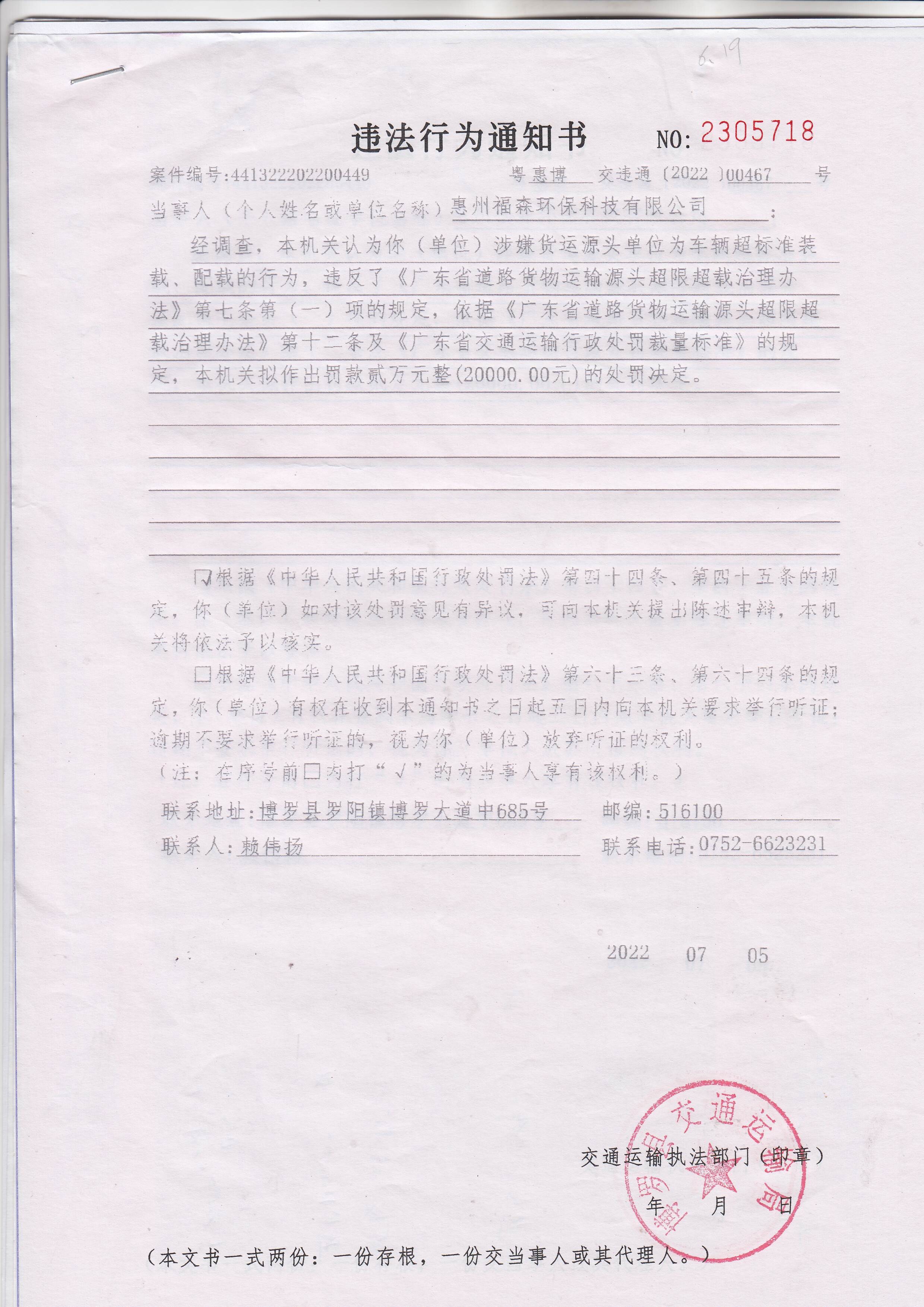 經(jīng)調(diào)查,本機(jī)關(guān)認(rèn)為你(單位)涉嫌貨運(yùn)源頭單位為車輛超標(biāo)準(zhǔn)裝載、配載的行為,違反了《廣東省道路貨物運(yùn)輸源頭超限超載治理辦法》第七條第(一)項(xiàng)的規(guī)定,依據(jù)《廣東省道路貨物運(yùn)輸源頭超限超載治理辦法》第十二條及《廣東省交通運(yùn)輸行政處罰裁量標(biāo)準(zhǔn)》的規(guī)定,本機(jī)關(guān)擬作出罰款貳萬元整(20000.00元)的處罰決定。因其他法定方式無法送達(dá),現(xiàn)依法向你單位公告送達(dá)《違法行為通知書》(惠博交字【222】00467號(hào)),自公告之日起30日內(nèi)來我局(博羅縣羅陽街道辦事處博羅大道中685號(hào))簽收,逾期視為送達(dá)。
