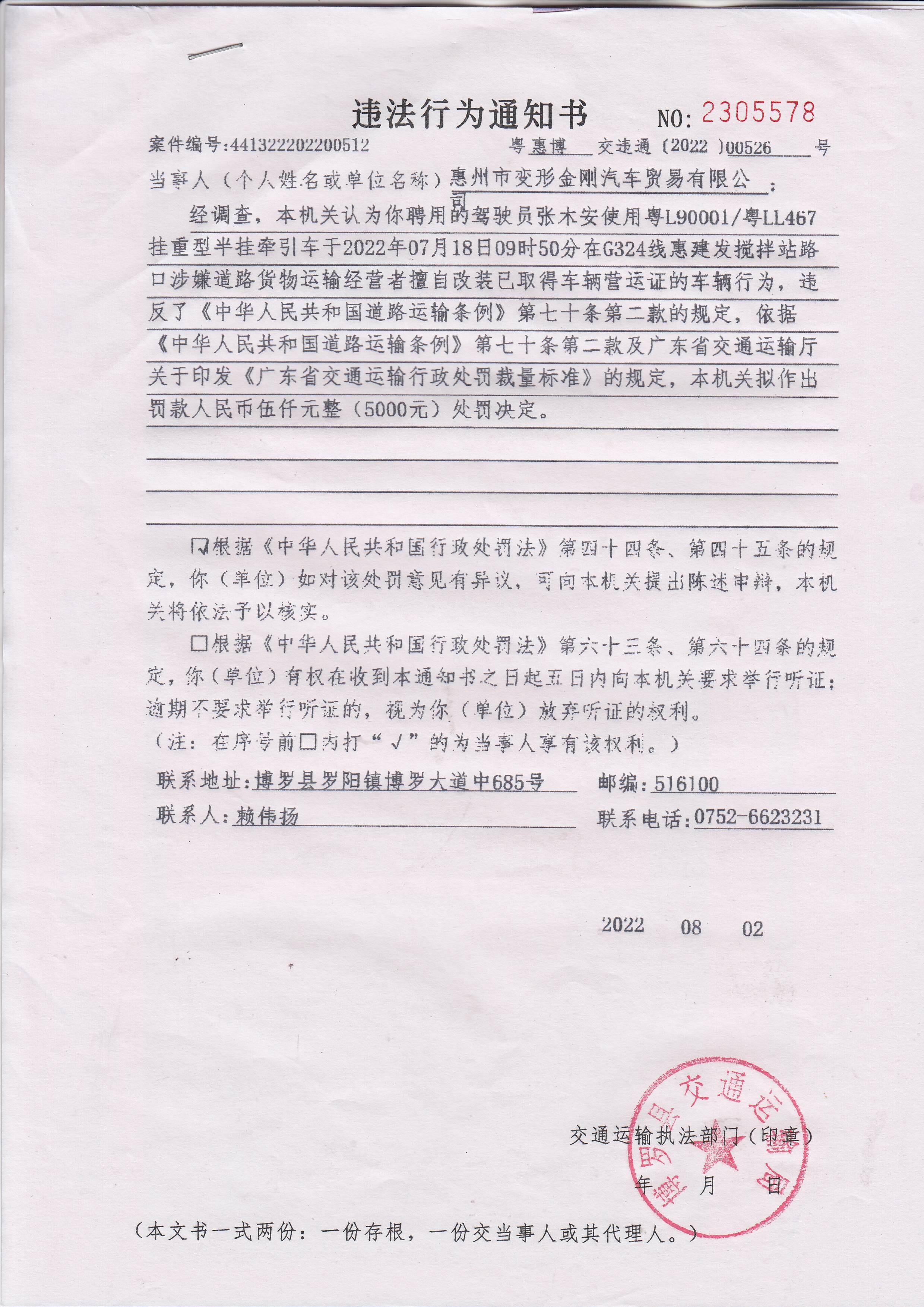 經調查,本機關認為你聘用的駕駛員張木安使用粵L90001/粵LL467掛重型半掛牽引車于2022年07月18日09時50分在G324線惠建發攪拌站路口涉嫌道路貨物運輸經營者擅自改裝已取得車輛營運證的車輛行為,違反了《中華人民共和國道路運輸條例》第七十條第二款的規定,依據《中華人民共和國道路運輸條例》第七十條第二款及廣東省交通運輸廳關于印發《廣東省交通運輸行政處罰裁量標準》的規定,本機關擬作出罰款人民幣伍仟元整(5000元)處罰決定。因其他法定方式無法送達,現依法向你單位公告送達《違法行為通知書》(惠博交字【2022】00526號),自公告之日起30日內來我局(博羅縣羅陽街道辦事處博羅大道中685號)簽收,逾期視為送達。