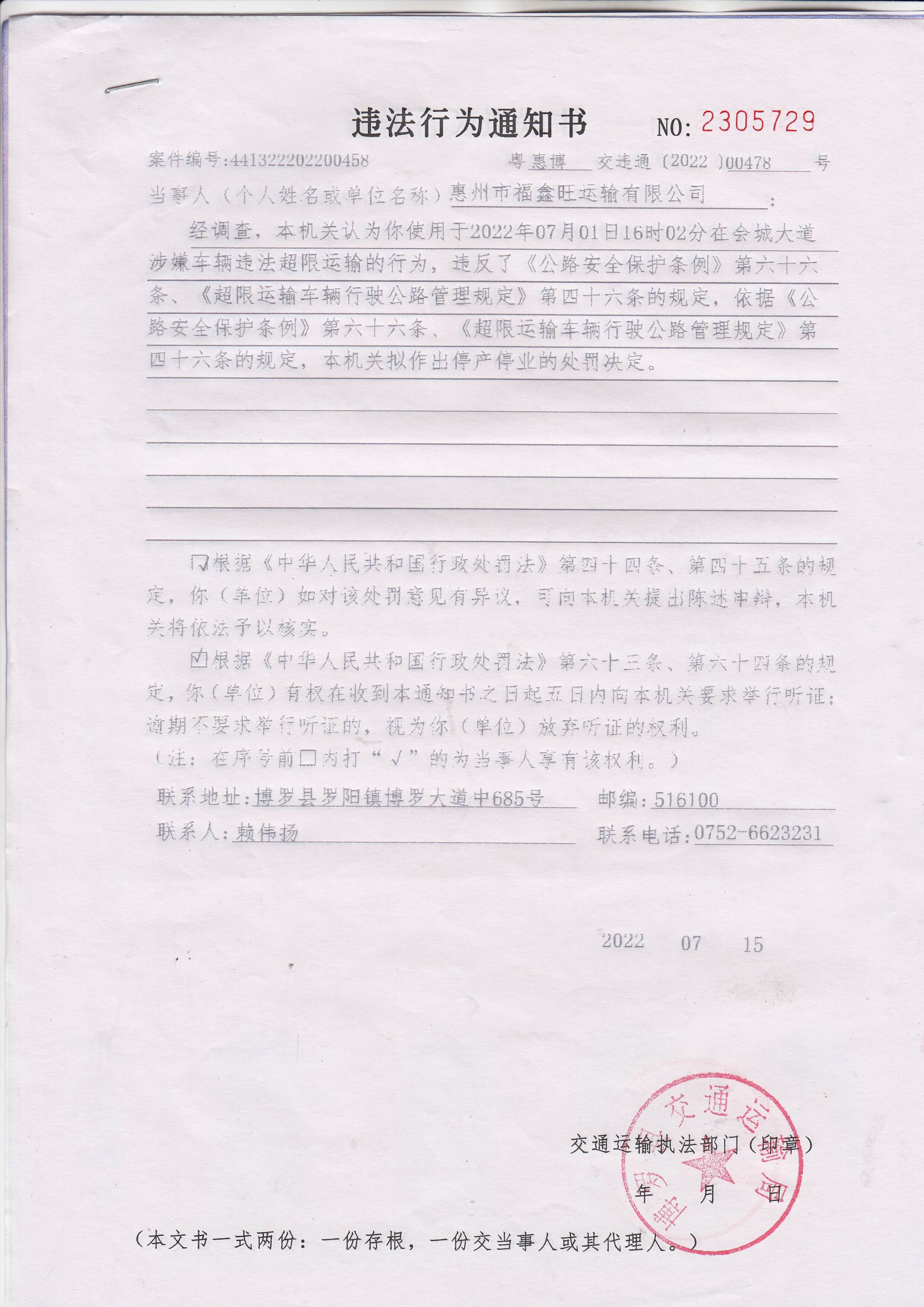 經(jīng)調(diào)查,本機(jī)關(guān)認(rèn)為你使用于2022年07月01日16時(shí)02分在會(huì)城大道涉嫌車輛違法超限運(yùn)輸?shù)男袨椋`反了《公路安全保護(hù)條例》第六十六條、《超限運(yùn)輸車輛行駛公路管理規(guī)定》第四十六條的規(guī)定,依據(jù)《公路安全保護(hù)條例》第六十六條、《超限運(yùn)輸車輛行駛公路管理規(guī)定》第四十六條的規(guī)定,本機(jī)關(guān)擬作出停產(chǎn)停業(yè)的處罰決定。因其他法定方式無法送達(dá),現(xiàn)依法向你單位公告送達(dá)《違法行為通知書》(惠博交字【2022】00478號(hào)),自公告之日起30日內(nèi)來我局(博羅縣羅陽街道辦事處博羅大道中685號(hào))簽收,逾期視為送達(dá)。