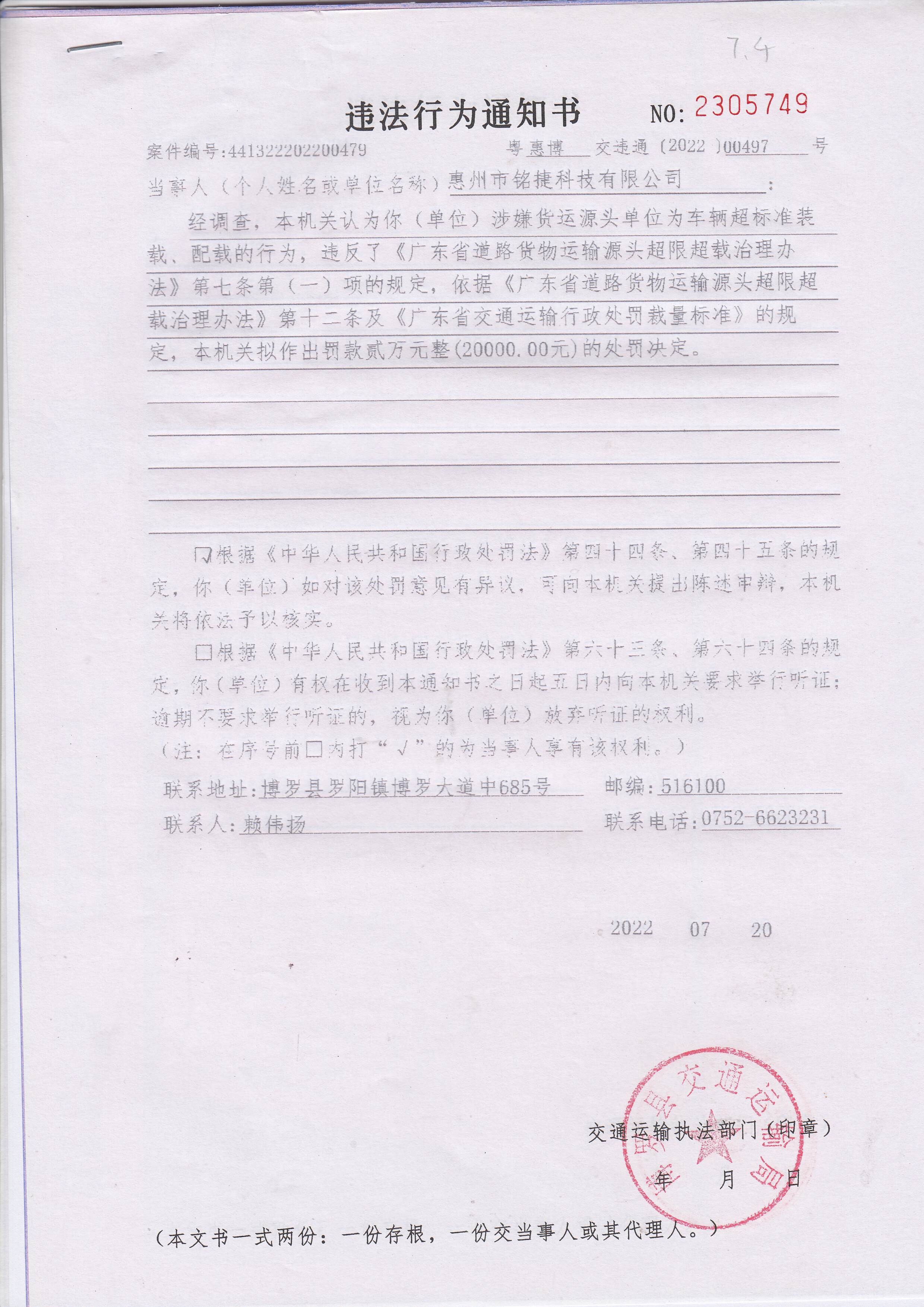 經(jīng)調(diào)查,本機關(guān)認(rèn)為你(單位)涉嫌貨運源頭單位為車輛超標(biāo)準(zhǔn)裝載、配載的行為,違反了《廣東省道路貨物運輸源頭超限超載治理辦法》第七條第(一)項的規(guī)定,依據(jù)《廣東省道路貨物運輸源頭超限超載治理辦法》第十二條及《廣東省交通運輸行政處罰裁量標(biāo)準(zhǔn)》的規(guī)定,本機關(guān)擬作出罰款貳萬元整(20000.00元)的處罰決定。因其他法定方式無法送達,現(xiàn)依法向你單位公告送達《違法行為通知書》(惠博交字【2022】00497號),自公告之日起30日內(nèi)來我局(博羅縣羅陽街道辦事處博羅大道中685號)簽收,逾期視為送達。