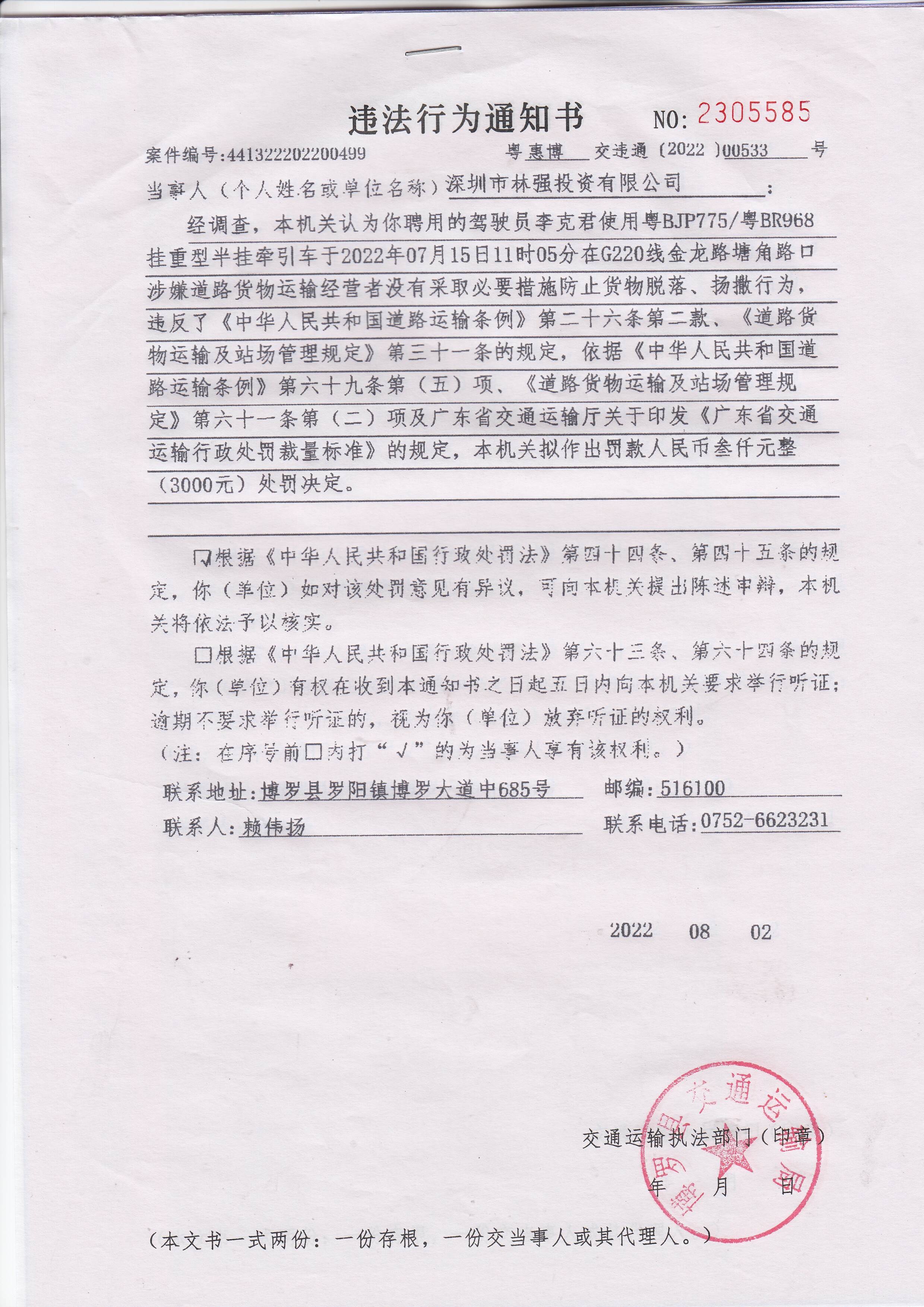經調查,本機關認為你聘用的駕駛員李克君使用粵BJP775/粵BR968掛重型半掛牽引車于2022年07月15日11時05分在G220線金龍路塘角路口涉嫌道路貨物運輸經營者沒有采取必要措施防止貨物脫落、揚撒行為,違反了《中華人民共和國道路運輸條例》第二十六條第二款、《道路貨物運輸及站場管理規定》第三十一條的規定,依據《中華人民共和國道路運輸條例》第六十九條第(五)項、《道路貨物運輸及站場管理規定》第六十一條第(二)項及廣東省交通運輸廳關于印發《廣東省交通運輸行政處罰裁量標準》的規定,本機關擬作出罰款人民幣叁仟元整(3000元)處罰決定。因其他法定方式無法送達,現依法向你單位公告送達《違法行為通知書》(惠博交字【2022】00533號),自公告之日起30日內來我局(博羅縣羅陽街道辦事處博羅大道中685號)簽收,逾期視為送達。