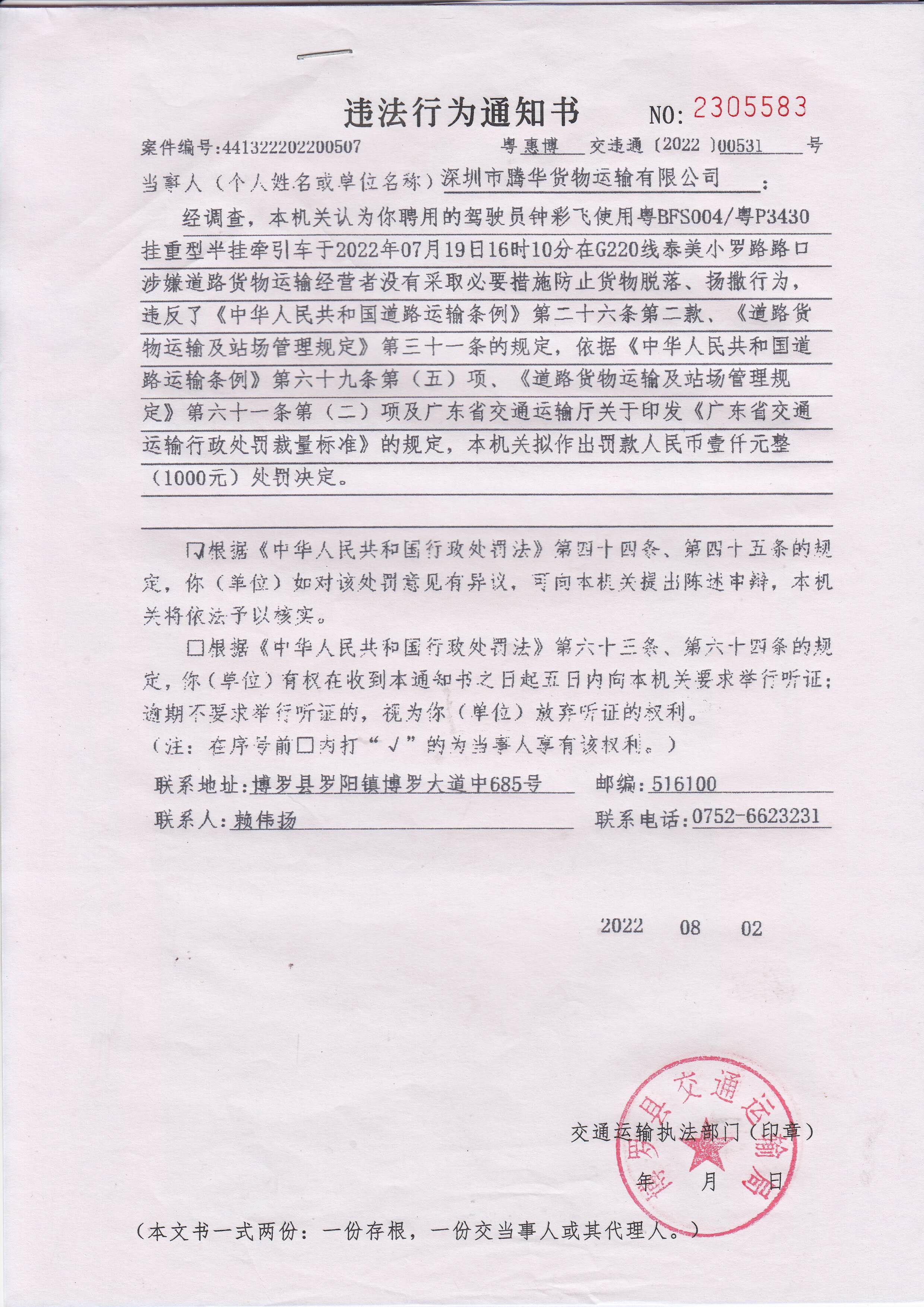 經調查,本機關認為你聘用的駕駛員鐘彩飛使用粵BFS004/粵P3430掛重型半掛牽引車于2022年07月19日16時10分在G220線泰美小羅路路口涉嫌道路貨物運輸經營者沒有采取必要措施防止貨物脫落、揚撒行為,違反了《中華人民共和國道路運輸條例》第二十六條第二款、《道路貨物運輸及站場管理規定》第三十一條的規定,依據《中華人民共和國道路運輸條例》第六十九條第(五)項、《道路貨物運輸及站場管理規定》第六十一條第(二)項及廣東省交通運輸廳關于印發《廣東省交通運輸行政處罰裁量標準》的規定,本機關擬作出罰款人民幣壹仟元整(1000元)處罰決定。因其他法定方式無法送達,現依法向你單位公告送達《違法行為通知書》(惠博交字【2022】00531號),自公告之日起30日內來我局(博羅縣羅陽街道辦事處博羅大道中685號)簽收,逾期視為送達。