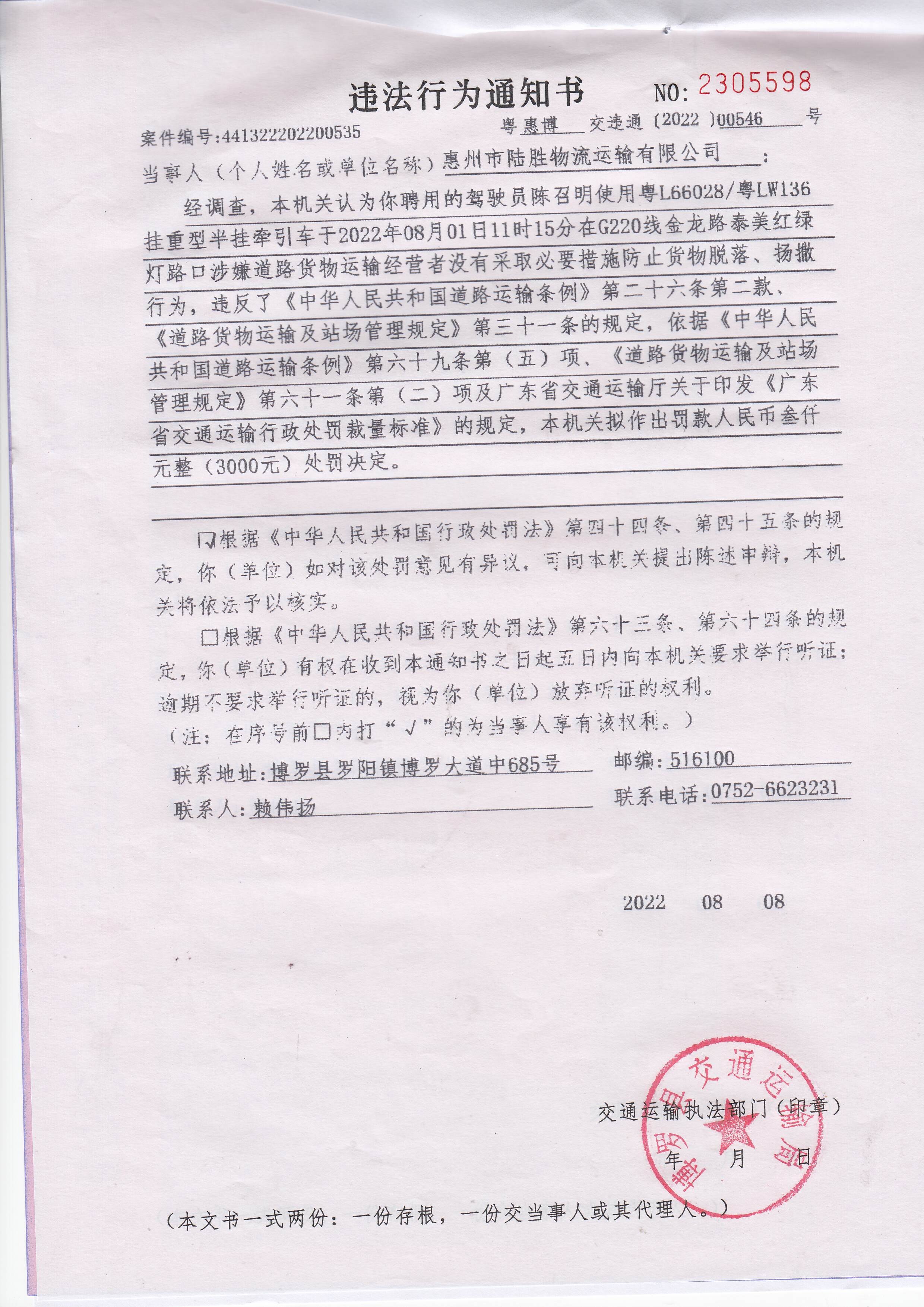 經(jīng)調(diào)查,本機(jī)關(guān)認(rèn)為你聘用的駕駛員陳召明使用粵L66028/粵LW136掛重型半掛牽引車于2022年08月01日11時15分在G220線金龍路泰美紅綠燈路口涉嫌道路貨物運(yùn)輸經(jīng)營者沒有采取必要措施防止貨物脫落、揚(yáng)撒行為,違反了《中華人民共和國道路運(yùn)輸條例》第二十六條第二款、《道路貨物運(yùn)輸及站場管理規(guī)定》第三十一條的規(guī)定,依據(jù)《中華人民共和國道路運(yùn)輸條例》第六十九條第(五)項、《道路貨物運(yùn)輸及站場管理規(guī)定》第六十一條第(二)項及廣東省交通運(yùn)輸廳關(guān)于印發(fā)《廣東省交通運(yùn)輸行政處罰裁量標(biāo)準(zhǔn)》的規(guī)定,本機(jī)關(guān)擬作出罰款人民幣叁仟元整(3000元)處罰決定。因其他法定方式無法送達(dá),現(xiàn)依法向你單位公告送達(dá)《違法行為通知書》(惠博交字【2022】00546號),自公告之日起30日內(nèi)來我局(博羅縣羅陽街道辦事處博羅大道中685號)簽收,逾期視為送達(dá)。