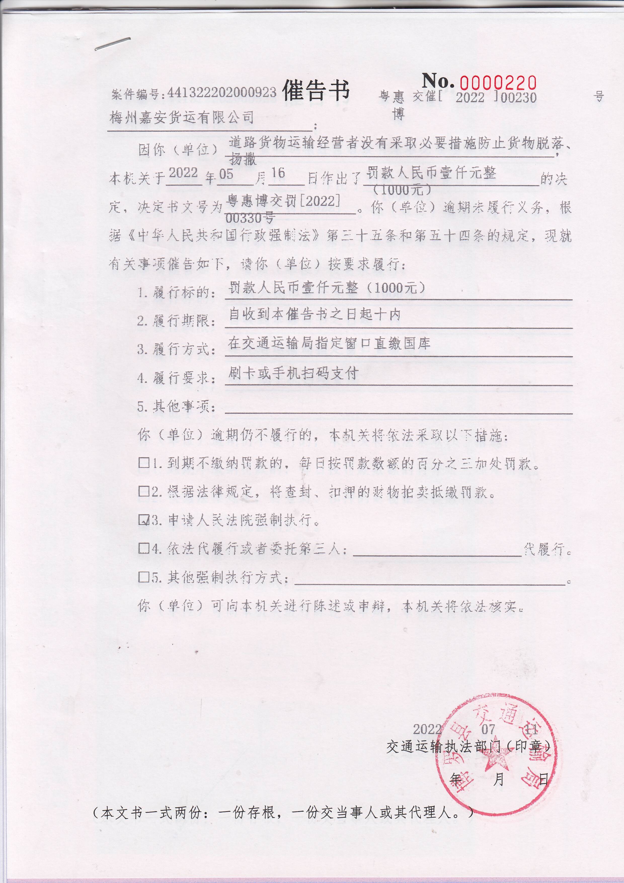 一、你公司使用粵MA2600/粵M6406掛重型半掛牽引車沒有采取必要措施防止貨物脫落、揚撒一案,本機關于2022年05月16日作出了罰款人民幣壹仟元整(1000元)的決定,決定書文號為:惠博交罰[2022]00330號),但你公司在本機關決定的期限內不履行義務。