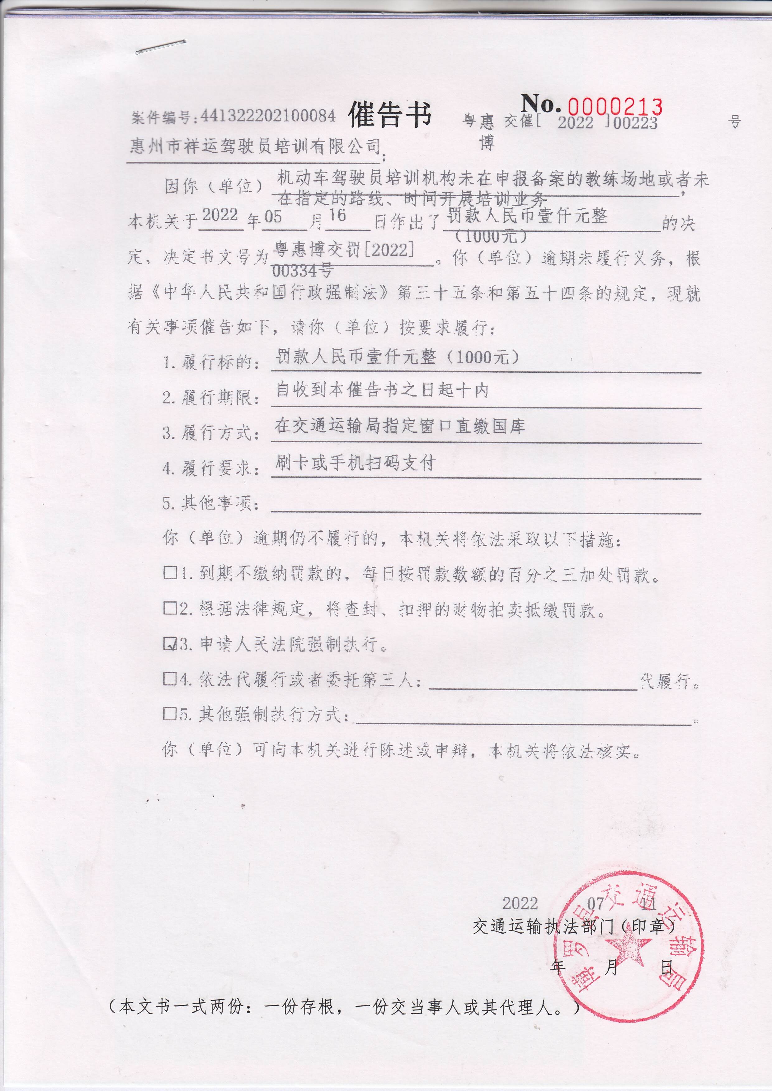一、你公司使用粵L6669學(xué)機動車駕駛員培訓(xùn)機構(gòu)未在申報備案的教練場地開展培訓(xùn)業(yè)務(wù)一案,本機關(guān)于2022年05月16日作出了罰款人民幣壹仟元整(1000元)的決定,決定書文號為:惠博交罰[2022]00334號),但你公司在本機關(guān)決定的期限內(nèi)不履行義務(wù)。