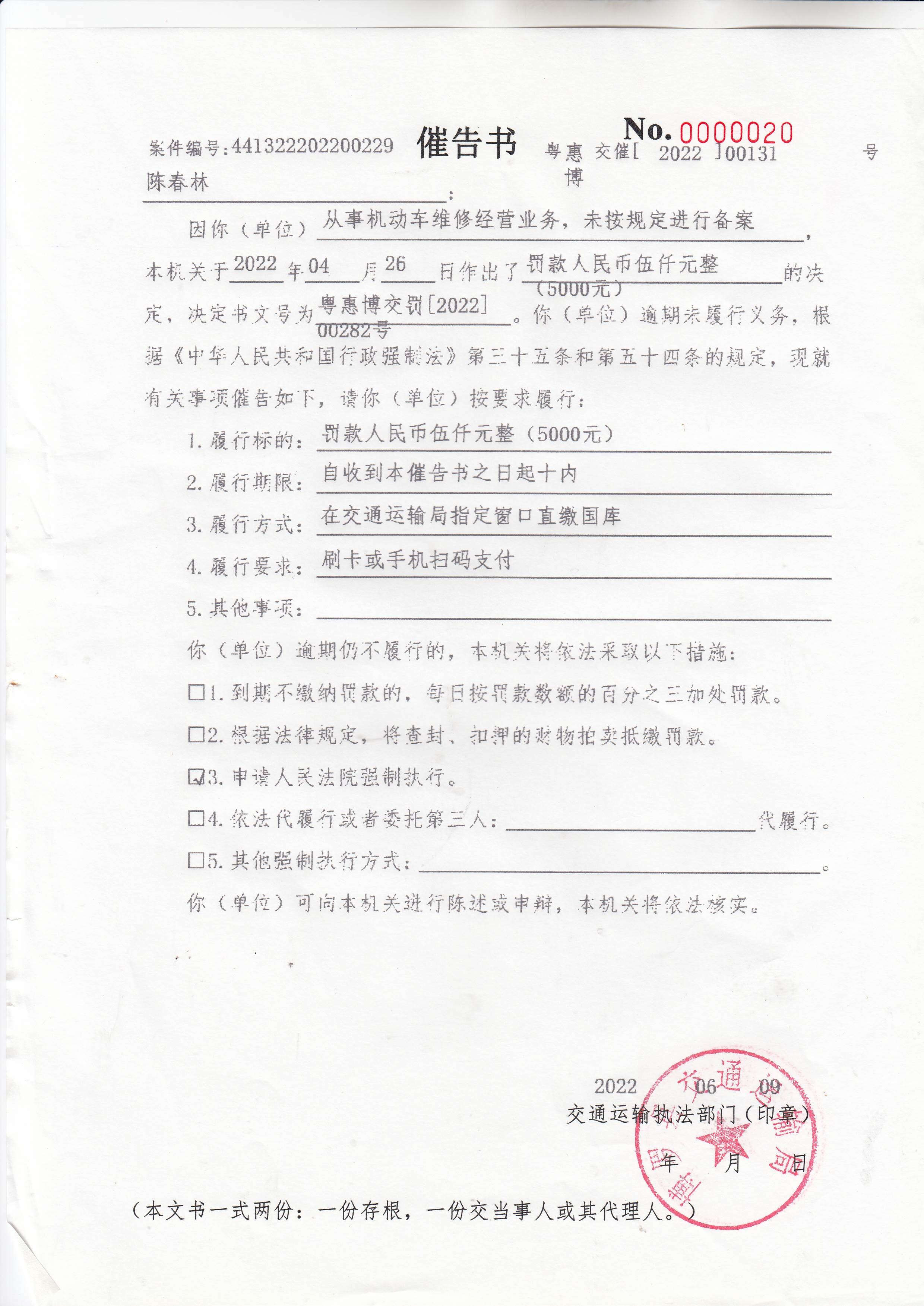 一、你從事機動車維修經營業務,未按規定進行備一案,本機關于2022年04月26日作出了罰款人民幣伍仟元整(5000元)的決定,決定書文號為:惠博交罰[2022]00282號),但你在本機關決定的期限內不履行義務。
