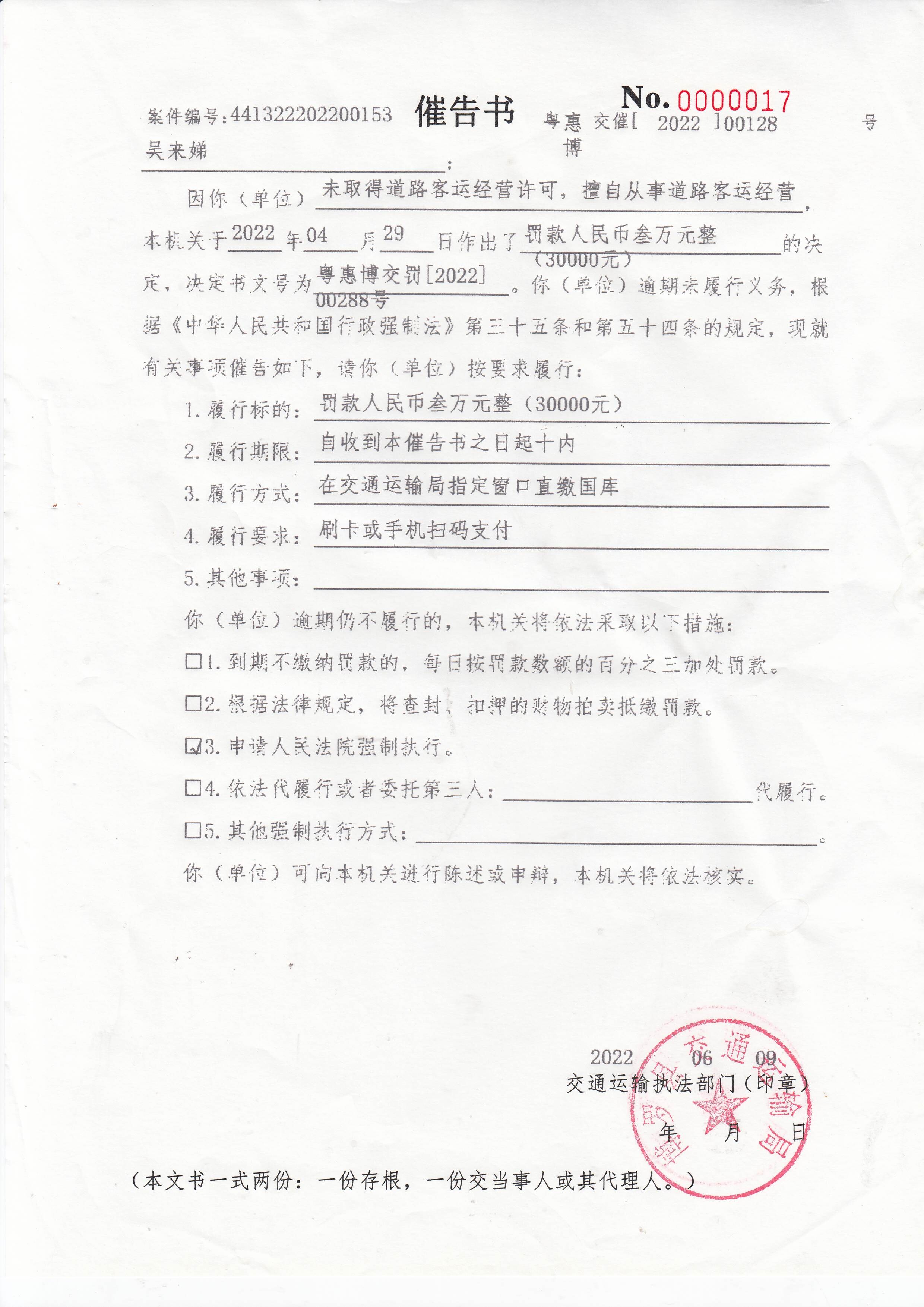 一、你使用粵L42871中型普通客車未取得道路客運經營許可,擅自從事道路客運經營一案,本機關于2022年04月29日作出了罰款人民幣叁萬元整(30000元)的決定,決定書文號為:惠博交罰[2022]00288號),但你在本機關決定的期限內不履行義務。