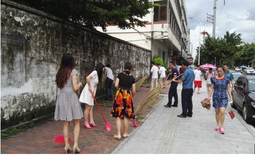 扛鐵鏟的,提著大掃帚的,拿著小掃把的,推著斗車的……按照清潔工具的不同,大家分工合作,熱情高漲,迅速投入到清潔衛(wèi)生的行動中。為了防止蚊蟲滋生,大家尤其加大了對污水和衛(wèi)生死角的清理,同時也對那些到處張貼,嚴重影響市容市貌的“牛皮廯”進行了清理。在清潔衛(wèi)生行動中涌現(xiàn)了許多感人的場面。墻角處的雜草,鐵鏟產(chǎn)不掉,掃把掃不了,有些人就毫不猶豫地用手去拔,全然不管滿手的泥巴,額頭上的熱汗;電線桿上的“牛皮廯”貼的很高,人夠不著,就幾個人冒著太陽和酷熱在下面托住,一個人上去清理,全然不顧那被汗水濕透的衣背。看著這些感人的場面,大家都仿佛受到了觸動和激勵,沒有一個人偷懶,沒有一個人抱怨。也一改平時坐在辦公室做事的斯文和沉著,發(fā)揚不怕苦不怕累的精神,積極地投身到勞動中。