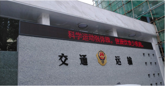 利用局機關大門LED顯示屏展示“科學運動強體魄、健康飲食少疾病”標語等內容公益廣告。