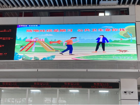 利用縣城中心客運站內電子顯示墻展示“隨地吐痰是陋習、公共衛生靠你我”等內容公益廣告。