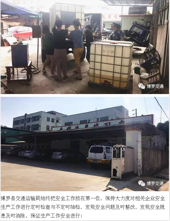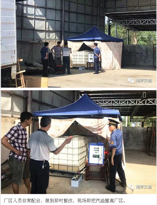 2017年10月11日晨,博羅縣交通運輸局綜合行政執法局一中隊執法人員和陸運股工作人員到湖鎮鎮惠明汽修廠檢查,發現廠區內存放有300升汽油,執法人員立即要求該廠負責人消除安全隱患,將該批汽油轉運至安全位置存放。