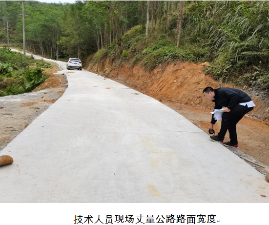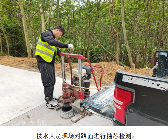 技術人員按照《廣東省農村公路建設工程質量監督管理實施細則》及《廣東省農村公路建設工程竣(交)工驗收辦法》(粵交質【2019】633號)的規定和要求,現場對項目路面的厚度、強度、平整度、寬度及構造深度等五項指標進行嚴格檢查和測量。通過丈量路面寬度和現場抽芯檢測,被抽查到的“四好農村路”路面的五項指標除砼強度(待檢測)外均符合工程質量要求及建設工程竣(交)工驗收規定。