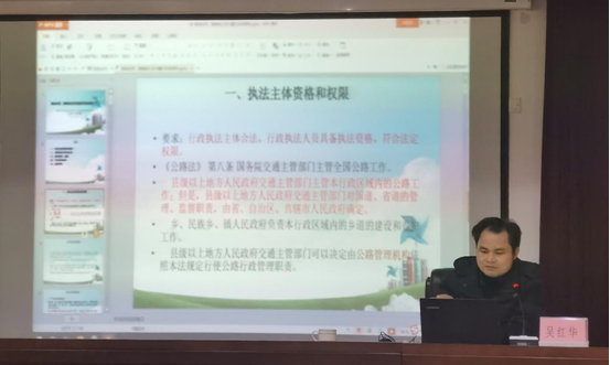 為進(jìn)一步規(guī)范交通執(zhí)法隊伍的執(zhí)法行為,打造一支高素質(zhì)的交通執(zhí)法隊伍,提高基層執(zhí)法工作人員執(zhí)法辦案能力和水平,切實做到依法行政,1月8日上午,博羅縣交通運輸局開展交通綜合執(zhí)法學(xué)習(xí)培訓(xùn)講座,邀請到吳紅華律師對違反《公路法》第五十四、五十條規(guī)定的交通綜合執(zhí)法進(jìn)行講座授課,執(zhí)法隊全體人員60余人參加講座。