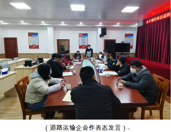 最后,運輸股廖旭輝股長對這8家道路運輸企業(yè)提出如下要求:一是思想上要重視,各運輸企業(yè)須提高企業(yè)駕駛員的交通安全意識,筑牢預(yù)防重大交通事故的第一道防線;二是行動上要落實,各運輸企業(yè)要深入貫徹落實會議精神,樹立“隱患就是事故”的理念,徹底根除道路安全隱患。8家道路運輸企業(yè)也就這次會議作了表態(tài),他們表示在今后的工作中要加強駕駛員的安全教育培訓(xùn),增強他們的安全生產(chǎn)意識,努力做到不超速,杜絕交通安全事故的發(fā)生。