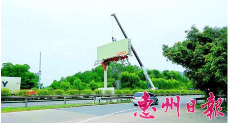 昨日上午,惠河高速公路泰美服務區附近兩塊違法廣告牌被拆除。據介紹,昨日開始,我市交通執法部門正式啟動高速公路違法廣告標牌清拆行動,計劃年底前將全市境內13條高速公路兩旁共300多塊違法廣告牌清拆完畢。