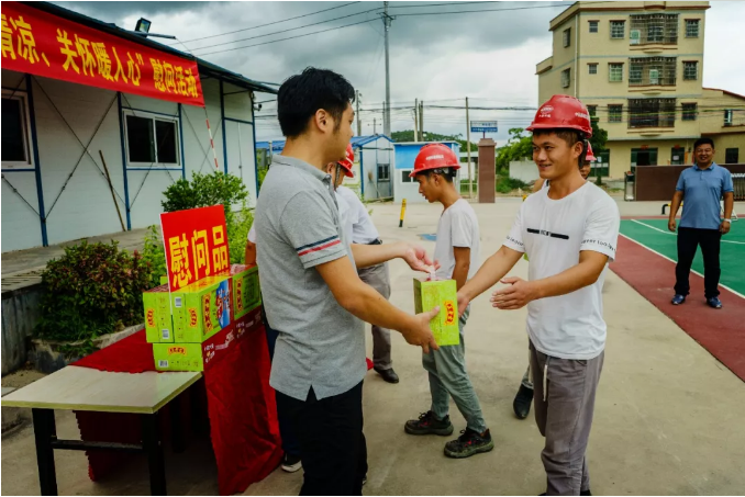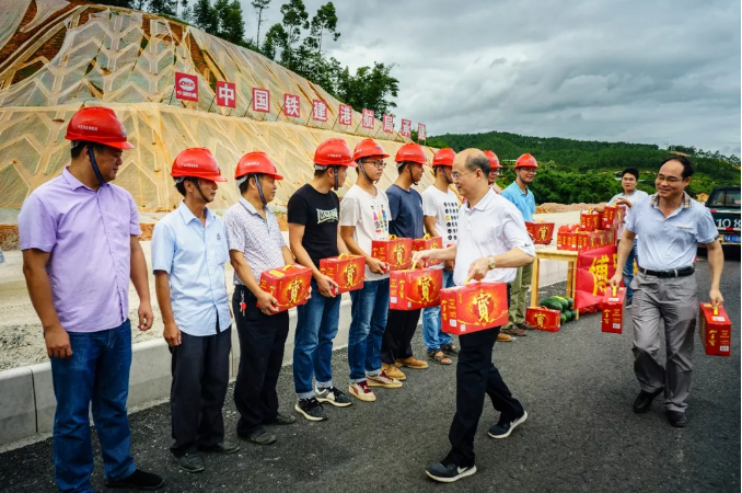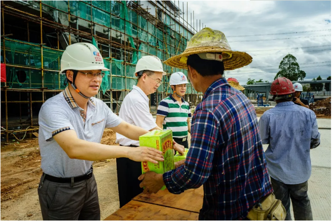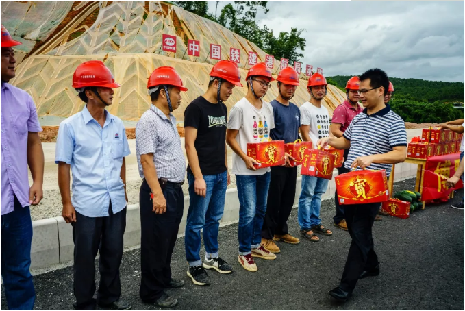 夏日送清涼、關(guān)懷暖人心,中鐵建港航局項(xiàng)目公司負(fù)責(zé)人為雙龍大道一線工人送上消暑飲品。