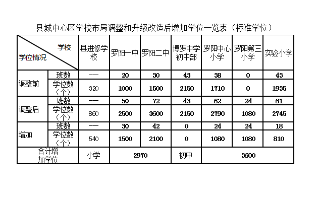 1.將現博師高級中學校區調整改造為羅陽二中新校區,將現縣教師進修學校校區及現羅陽二中校區整合,調整改造為實驗小學新校區;將現實驗小學校區調整改造為縣教師進修學校新校區。