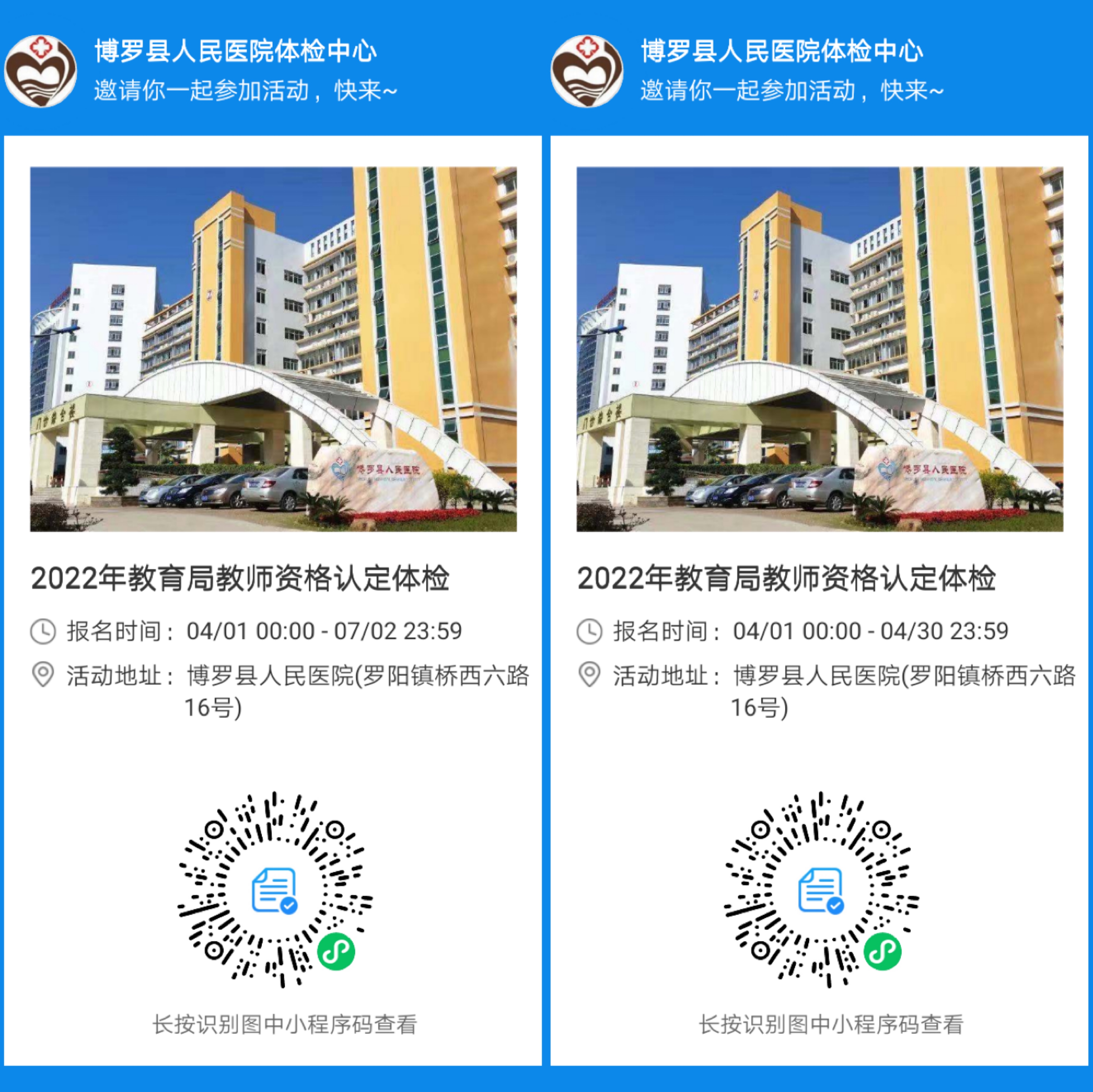 申請人在規定時間內:第一階段體檢時間4月24日-4月29日,第二階段6月24日-6月29日(申請人需掃碼預約,每天限50個號)攜帶本人有效身份證原件和近期免冠正面1寸彩色白底證件照,到博羅縣人民醫院體檢中心(博羅縣羅陽鎮橋西六路16號)進行體檢。體檢人員自行下載雙面打印體檢表(見附件2),空腹抽血項目于體檢當天的10:30前完成。體檢費用自理。