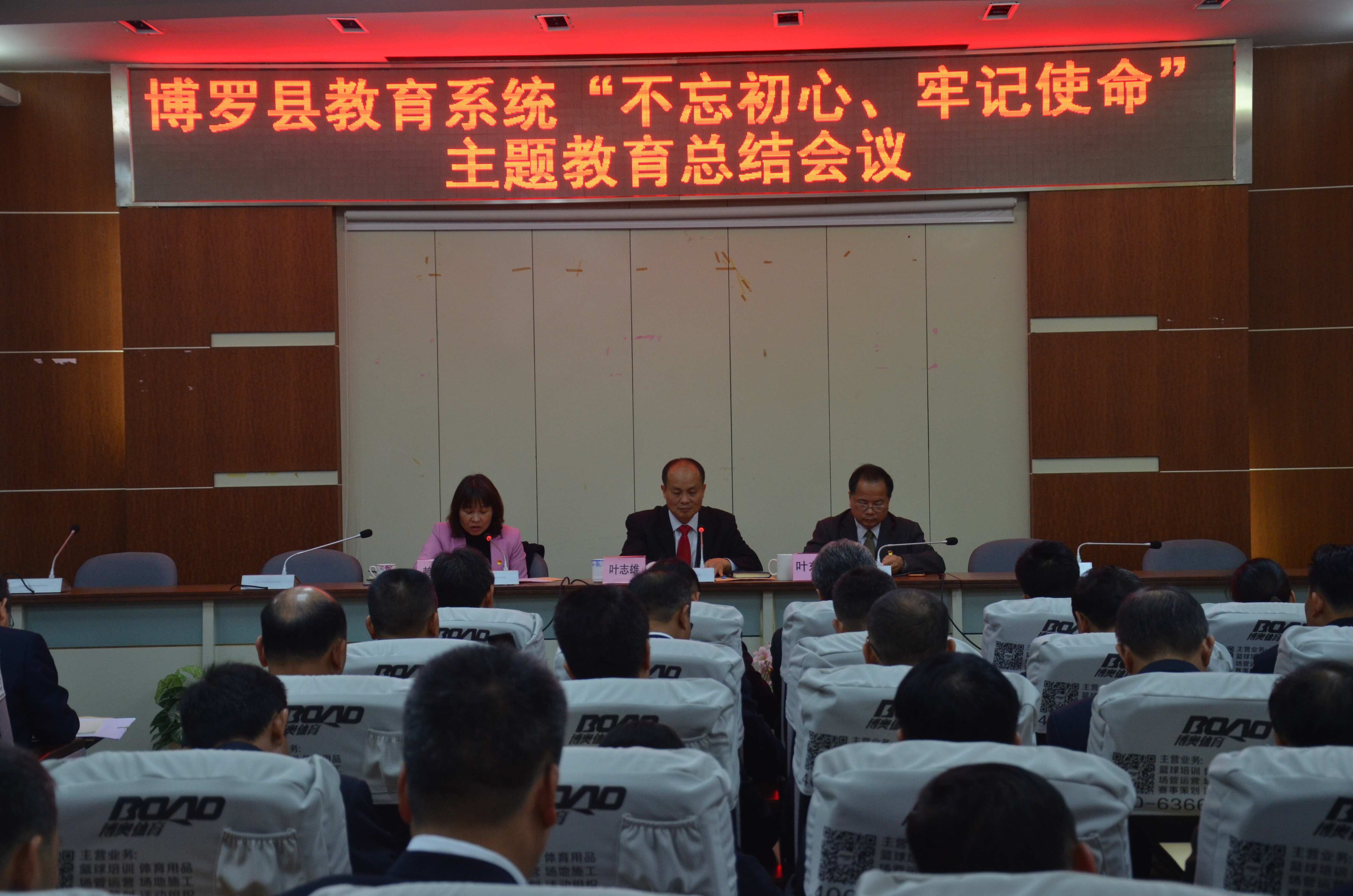 1月17日下午,博羅縣教育系統(tǒng)“不忘初心、牢記使命”主題教育總結(jié)會議在局機關(guān)1號會議室召開。縣教育局領(lǐng)導班子全體成員、各股室負責人,縣直學校,各鎮(zhèn)(街、管委會)中學、中心小學(中心學校)書記、校長參加會議,縣委主題教育第九指導組組長葉東良、聯(lián)絡員何宇惠出席會議,縣委教工委專職副書記、局黨組副書記賴其珍主持會議。
