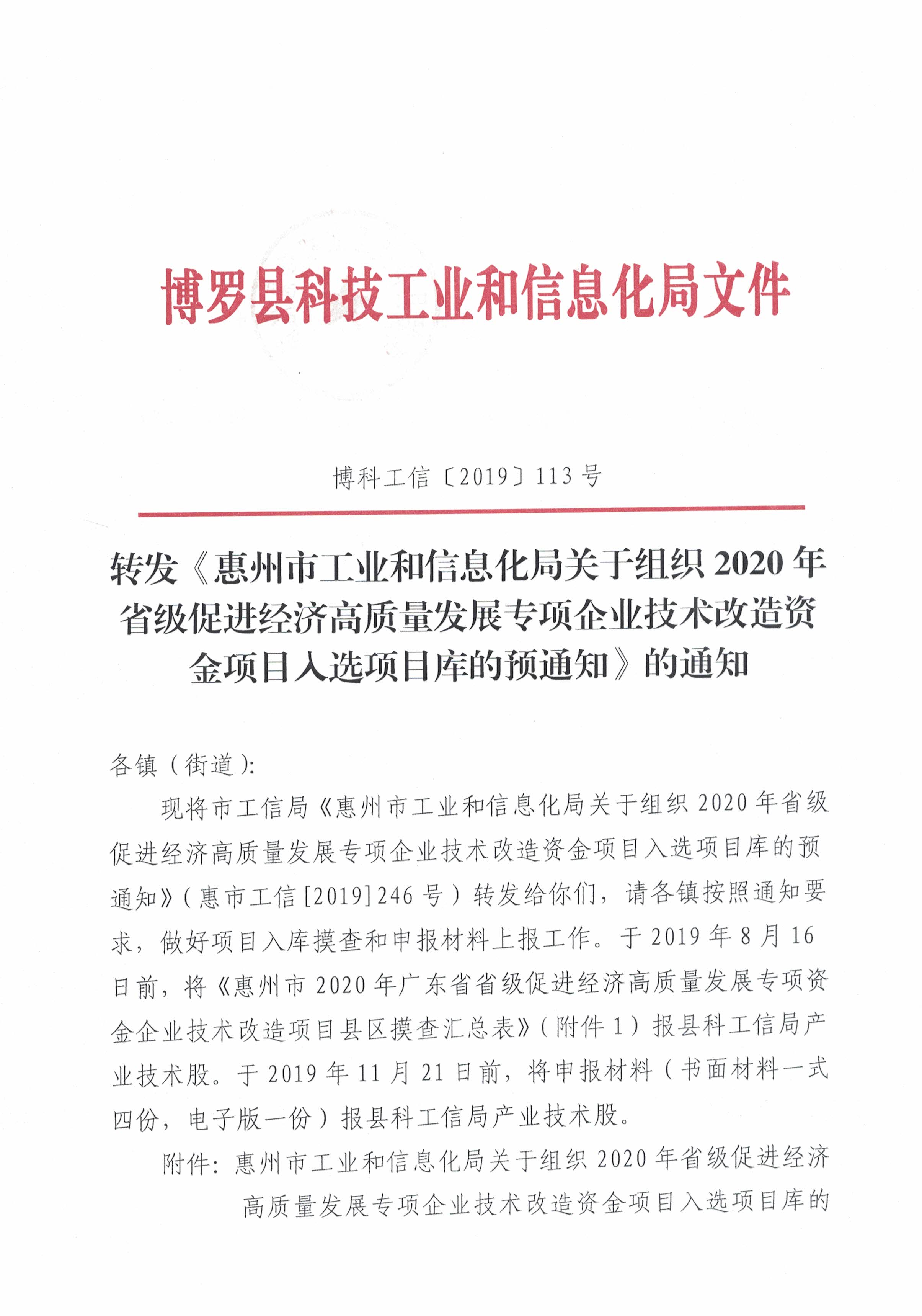 附件:惠州市工業(yè)和信息化局關于組織2020年省級促進經(jīng)濟高質(zhì)量發(fā)展專項企業(yè)技術改造資金項目入選項目庫的預通知