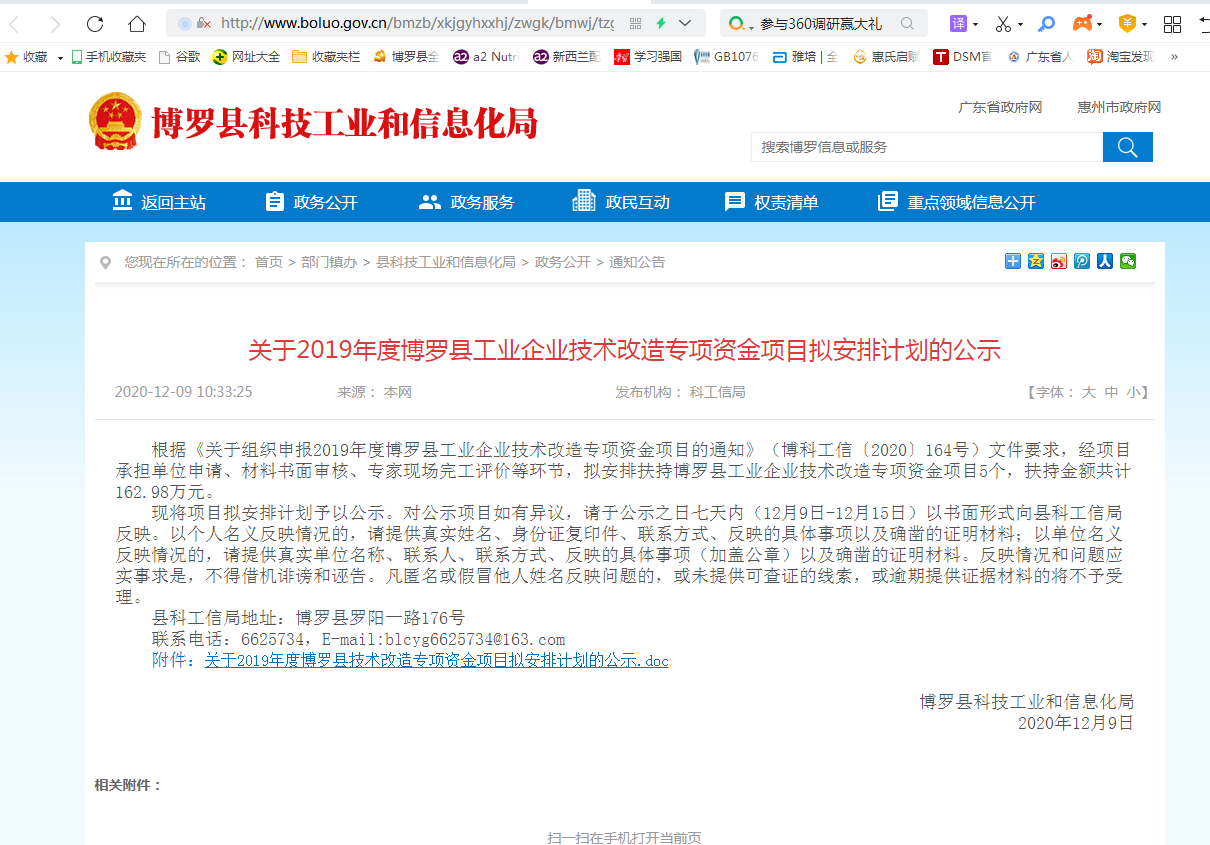 按照相關規定,2020年12月9日至12月15日,博羅縣科技工業和信息化局對2019年度博羅縣工業企業技術改造專項資金安排計劃進行了公示,期間未收到任何異議。
