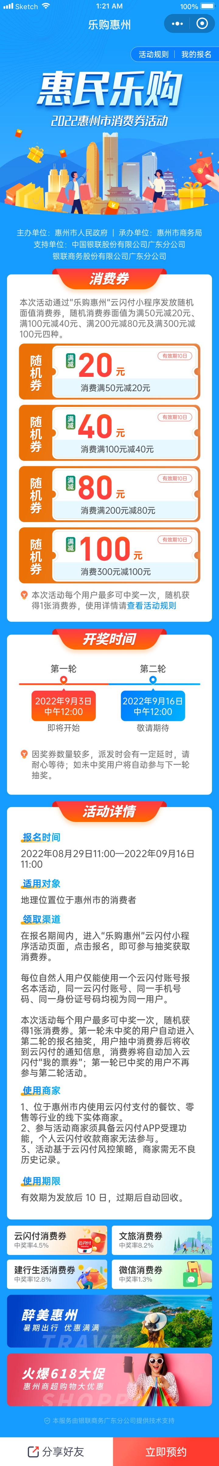 2022年8月29日上午11:00起開放預約報名,報名“惠州消費券”的操作路徑如下: