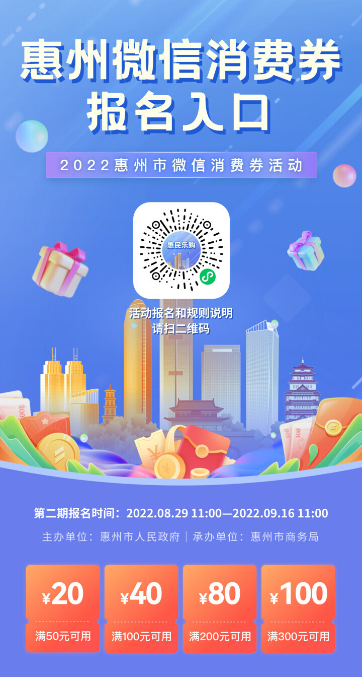 為持續擴大內需、促進消費回暖,進一步激發消費活力、刺激消費增長,讓市民得實惠、讓企業得實利,2022年惠州市“惠民樂購”第二期消費券活動將于2022年8月29日至9月26日在全市展開。我縣大力發動商家企業資源,共同推出折扣、滿減、贈券等企業優惠,共同賦能、讓利于民,吸引更多消費者參與,提振消費市場信心。具體時間為8月29日起預約報名,9月3日第一輪開獎,9月16日第二輪開獎。