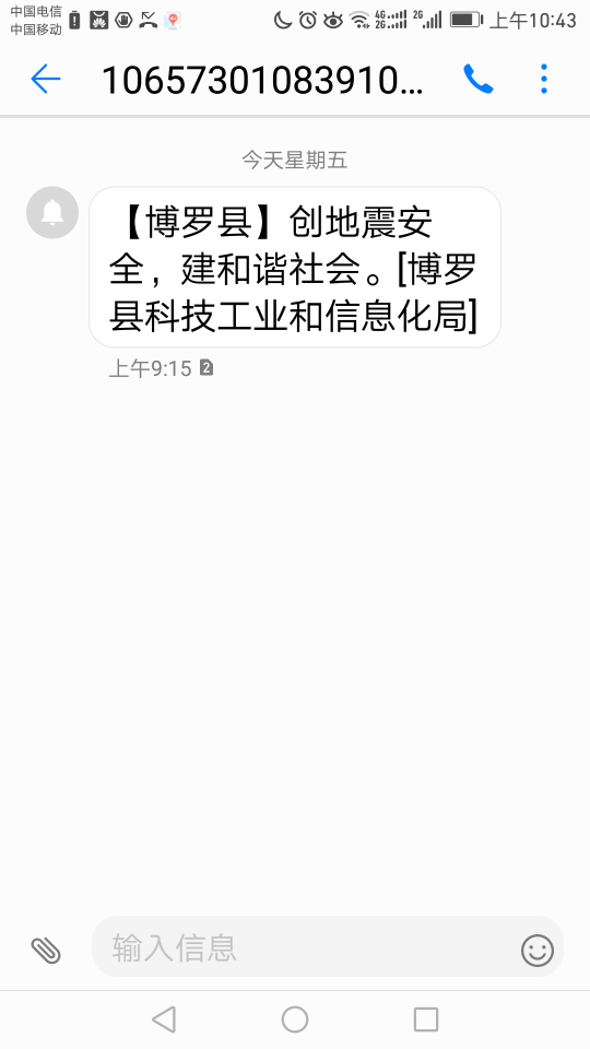 三、2017年5月8日至14日期間,我局利用短信平臺向社會大眾發送地震宣傳短信,進一步擴大宣傳教育面,引導群眾注重減輕社區災害風險,提升基層減災能力。
