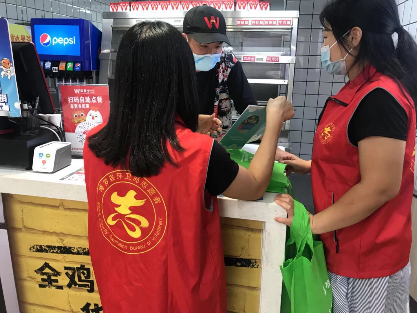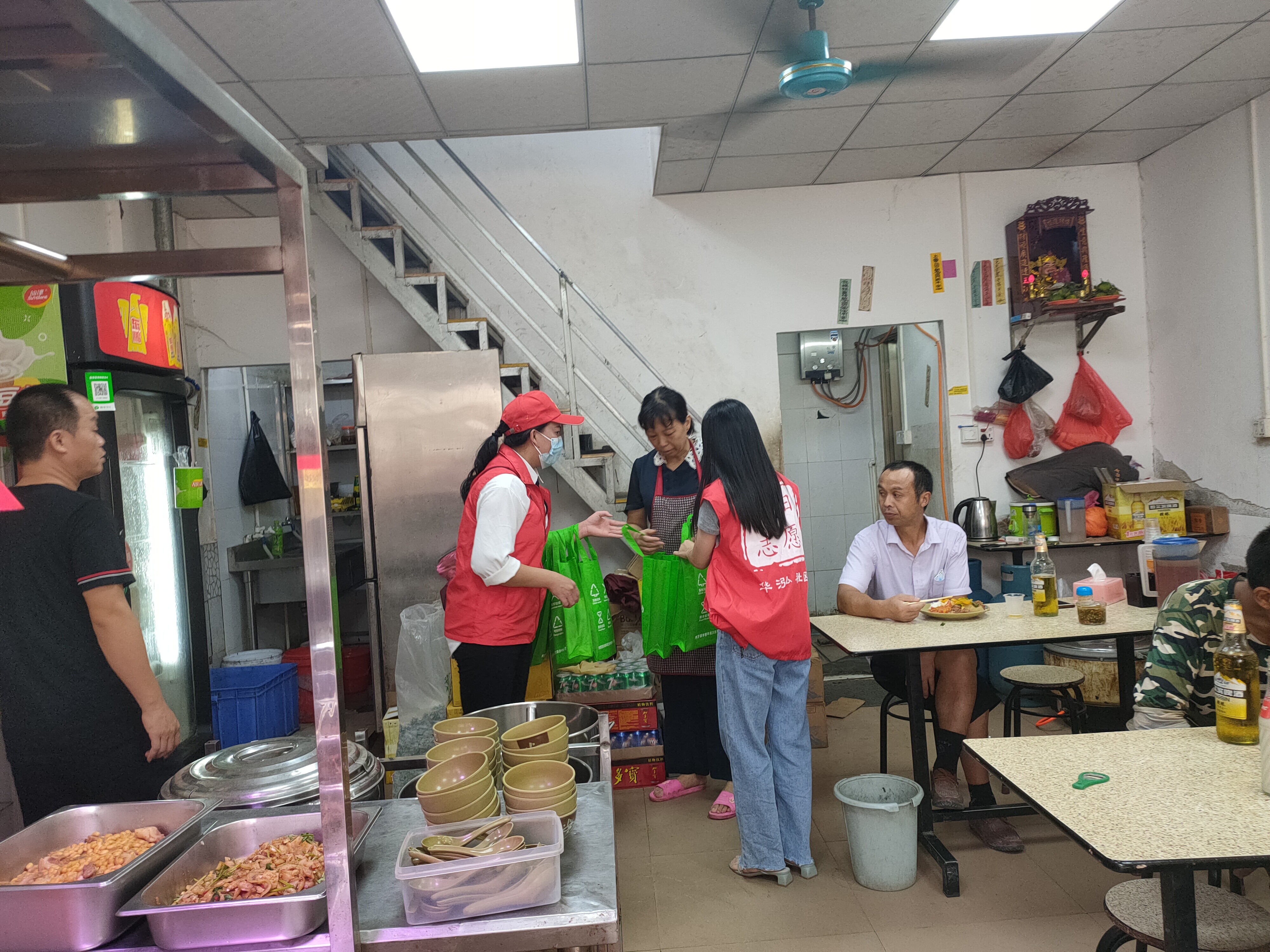 另一組工作人員抵達周邊商戶,通過分發(fā)垃圾分類宣傳資料與講解垃圾分類知識相結(jié)合的方式,幫助商戶了解到更多垃圾分類知識,推動“綠色、低碳、環(huán)保”的理念深入經(jīng)營理念中。