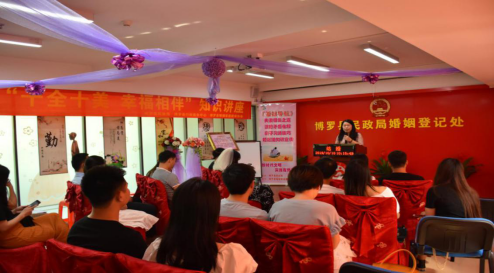 2019年10月10日,結合開展新時代文明實踐活動,博羅縣民政局婚姻登記處在頒證室開展了“十全十美.幸福相伴”新婚講座。講座參與人數約30人,當天共辦理婚姻登記61對。